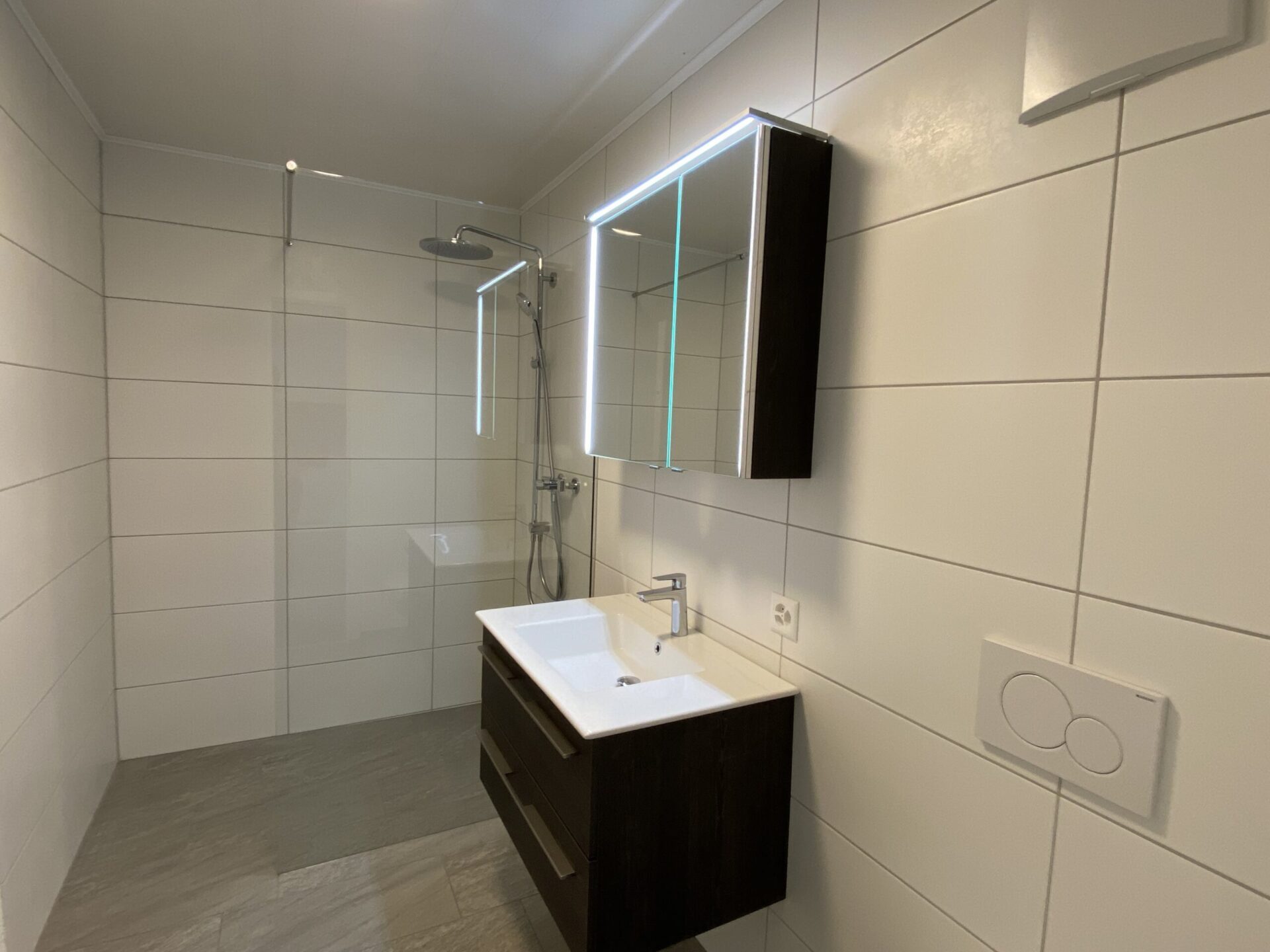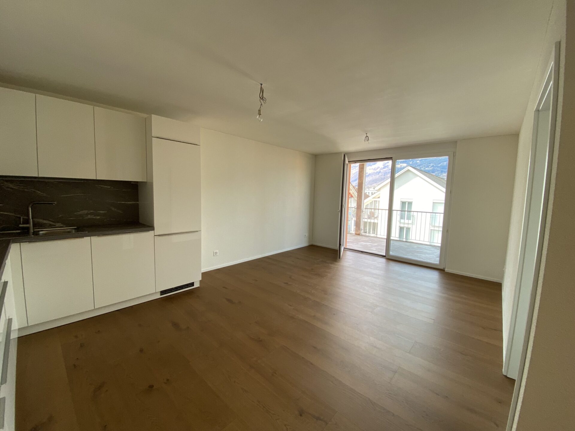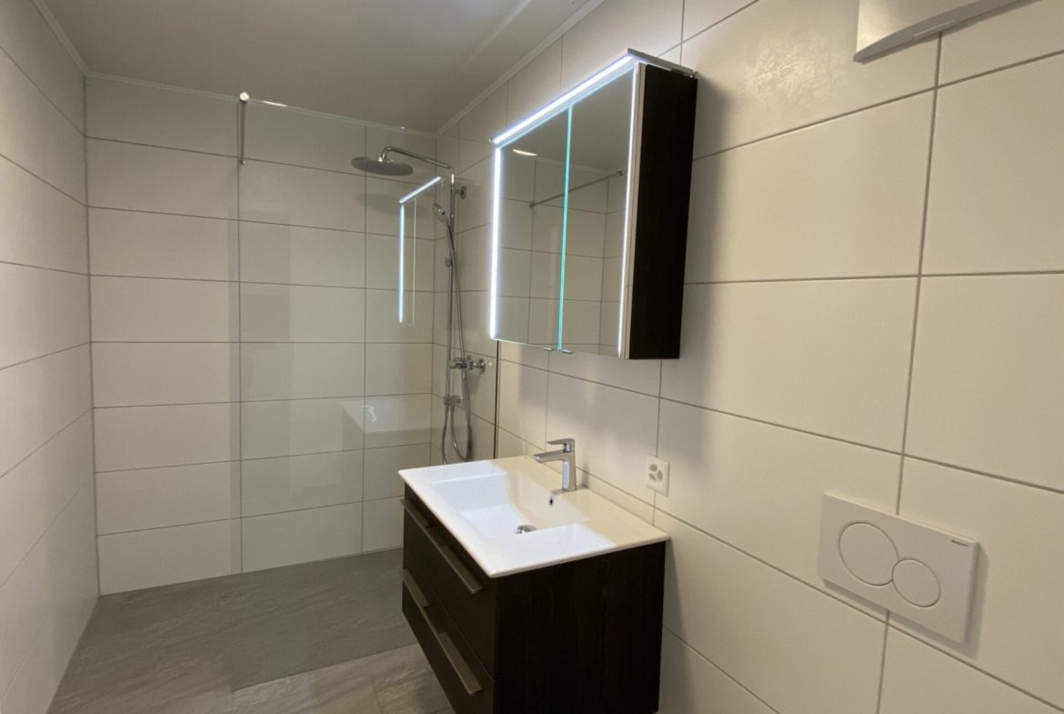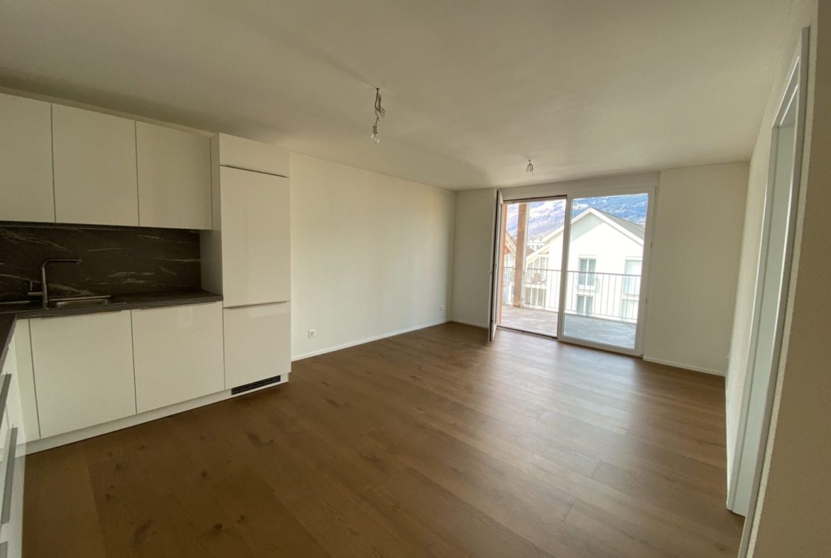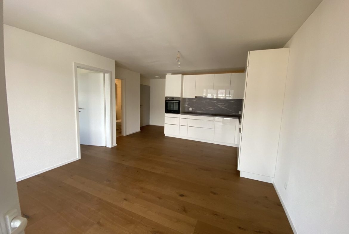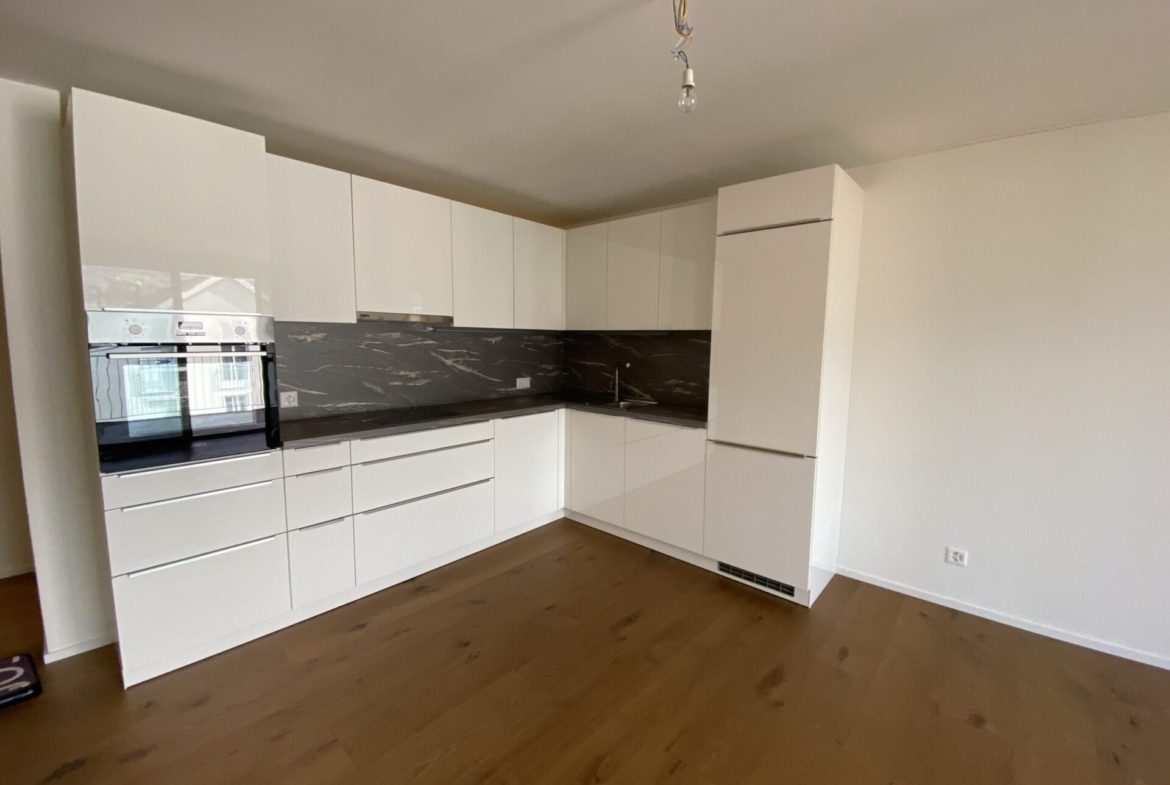 Der Wohn- und Essbereich ist zur Küche hin offen gestaltet. Hinter der Küche befindet sich ein geräumiger Wirtschaftsraum mit WM/TU sowie einem Lavabo und einer Arbeitsfläche. Die gesamte Wohnung ist barrierefrei zugänglich.