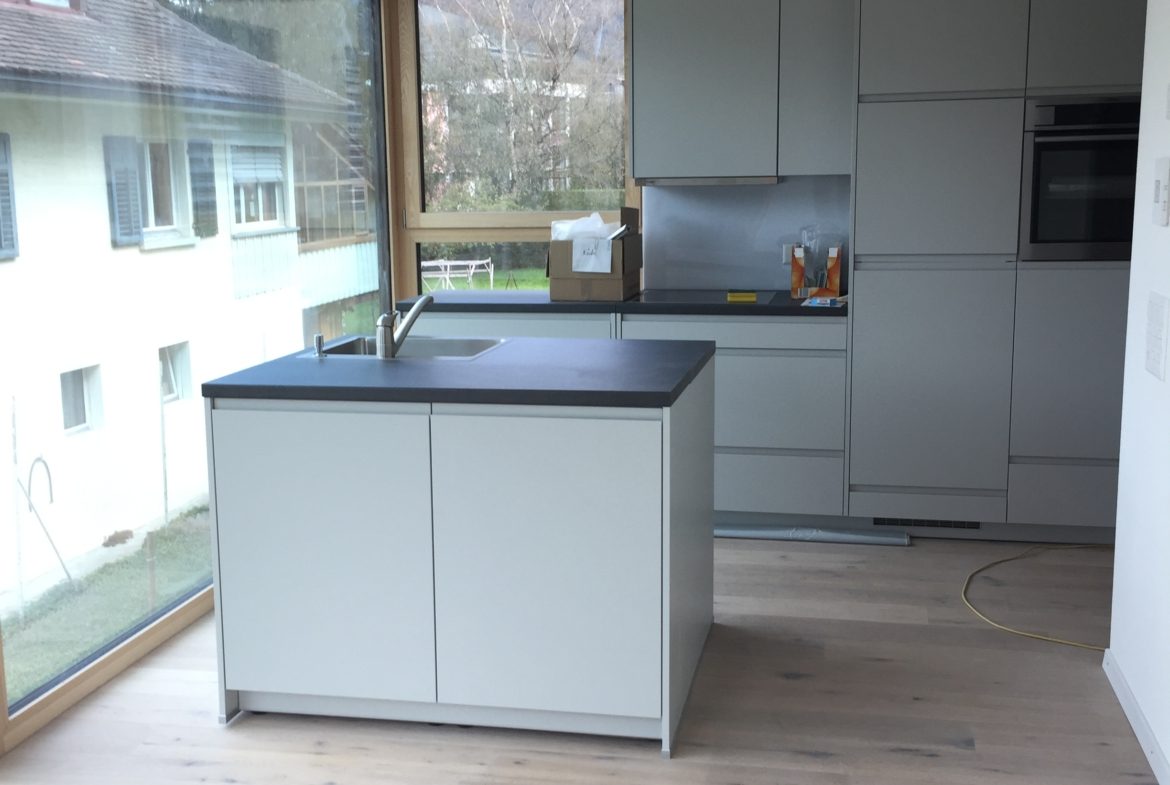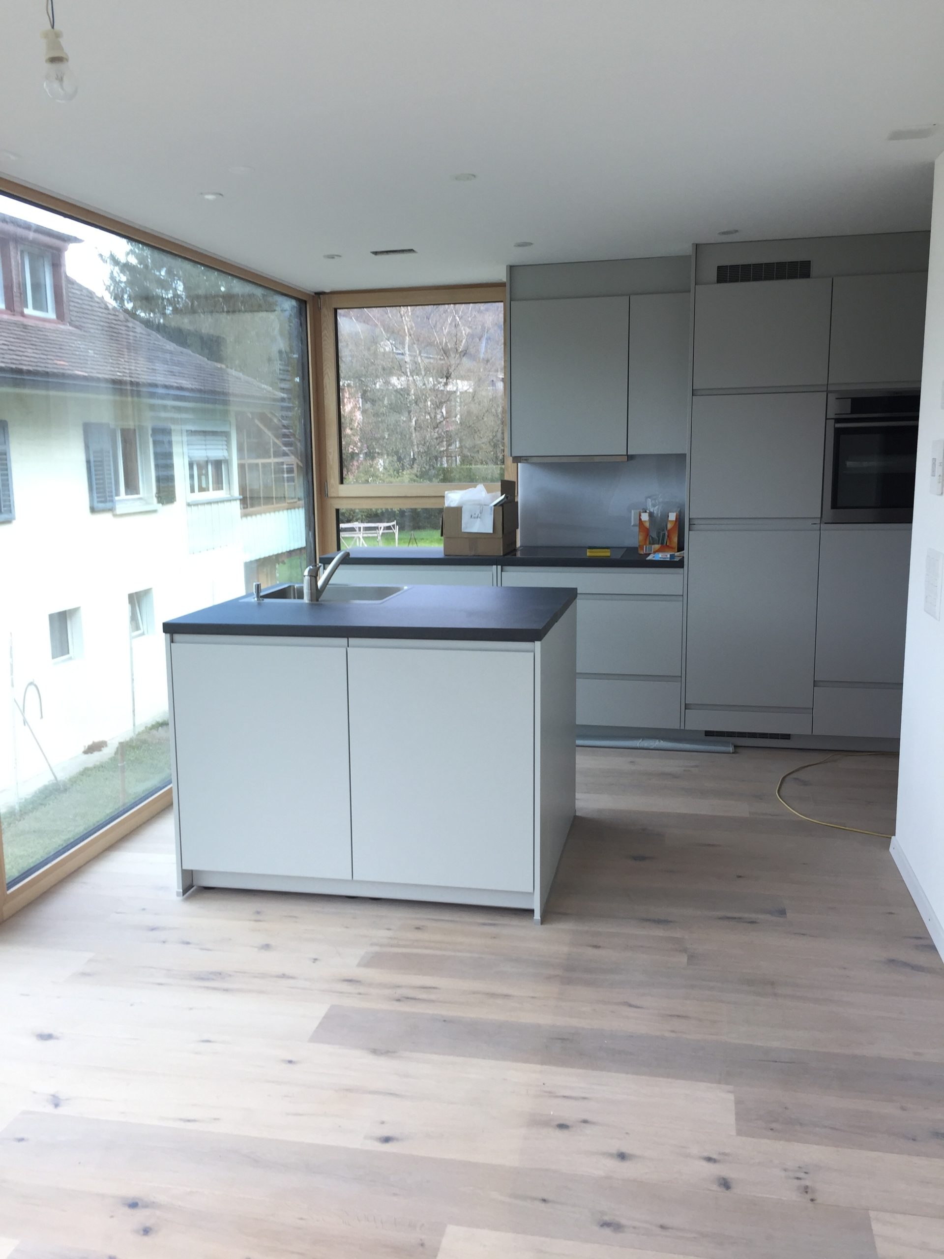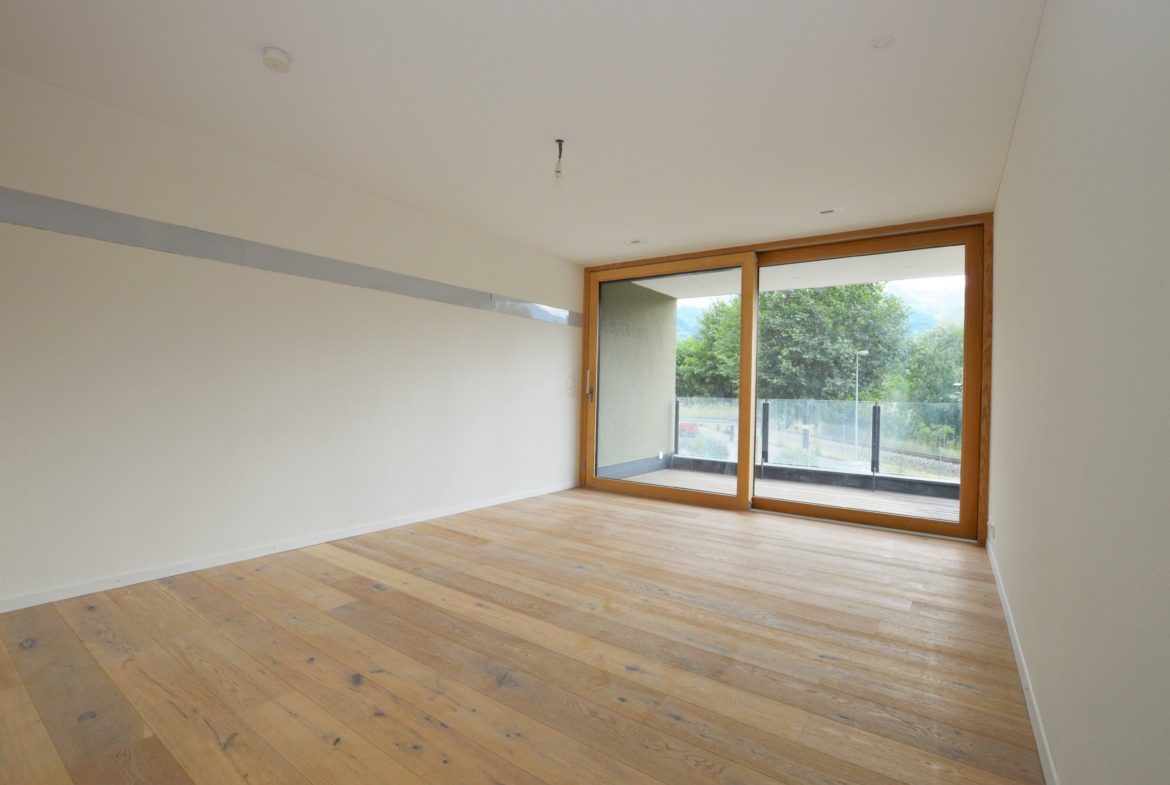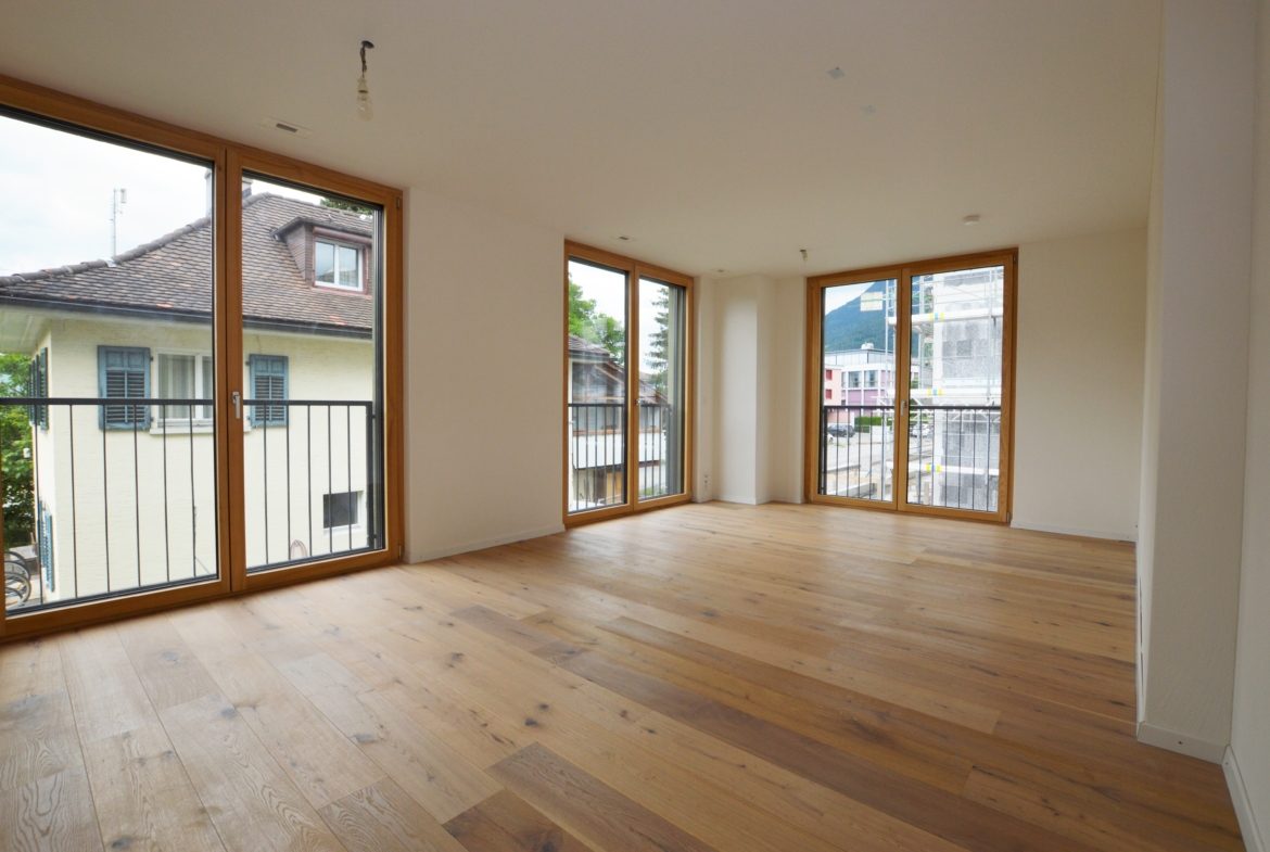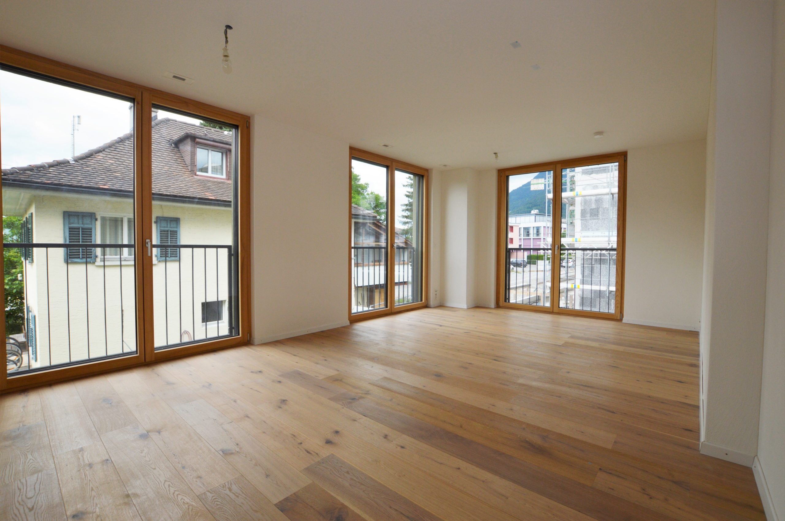 Diese 3.5 Zimmerwohnung im 1. Obergeschoss ist nach Nord-West ausgerichtet und verfügt über einen offenen Wohnbereich mit raumhohen, wärme-isolierenden und schallschutz Fensterfronten. Ein unverbaubarer, überdeckter Balkon von ca. 8 m2 bietet Aussicht aufs Grüne und Berge. Die moderne Küche mit freistehender Kochinsel, grossem Kühlschrank und separatem Tiefkühler ist gut durchdacht. Der östliche Teil der Wohnung ist aufgeteilt in Bade-, Kinder- und Schlafzimmer. Kinder- und Schlafzimmer sind z.Zt. als offener Raum konzipiert und gestaltbar. Die raumhohen Fensterfronten können komplett geöffnet werden. Hochwertige Materialien und Eichenparkett-Boden sind in der ganzen Wohnung verbaut. WM / TU stehen mittels Key-Funktion individuell im Untergeschoss (Keller) zur Verfügung.