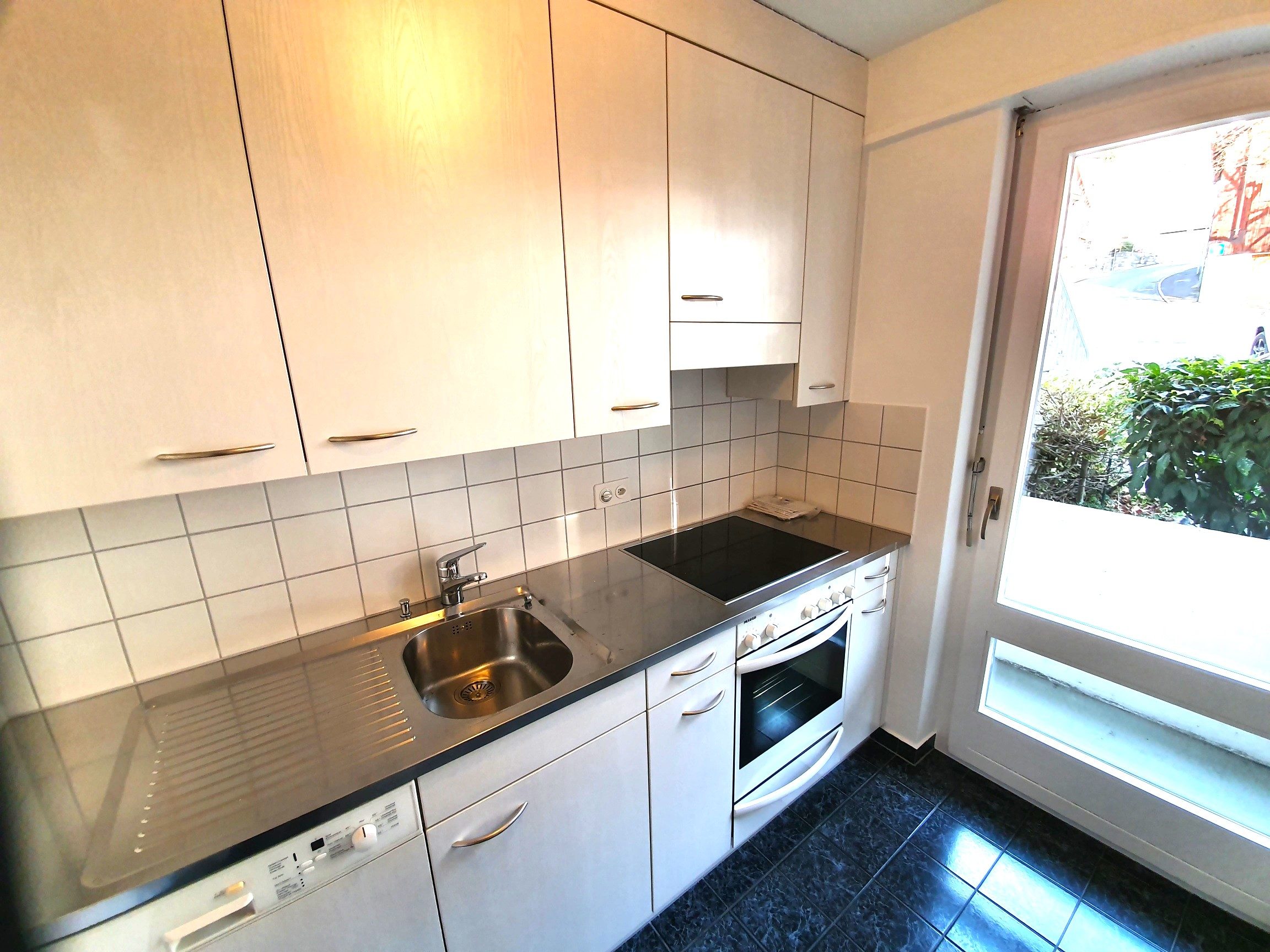 Die Küche verfügt über eine Geschirrspülmaschine, einen Glaskeramikkochherd sowie einen Backofen und einen Kühlschrank mit Tiefkühlabteil. Ebenfalls praktisch ist der zwischen der Küche und dem Essbereich liegende Einbauschrank, welcher von beiden Seiten zugänglich ist und über eine Durchreiche verfügt. Ebenfalls gibt es bei der Küche einen kleinen Balkon mit Ostausrichtung.