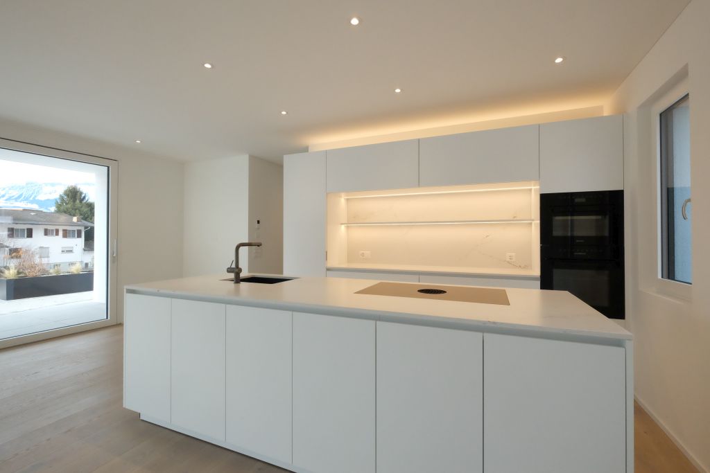 Die moderne Küche ist harmonisch in den Wohnraum integriert und mit hochwertigen Geräten ausgestattet. Drei Schlafzimmer, darunter ein grosszügiges Masterzimmer mit eigenem Bad (Badewanne/WC), sowie ein stilvoll ausgestattetes Badezimmer (DU/WC) bieten ein hohes Mass an Komfort. Ein separater Hauswirtschaftsraum innerhalb der Wohnung mit WM/TU sorgt für zusätzlichen Stauraum und Funktionalität.