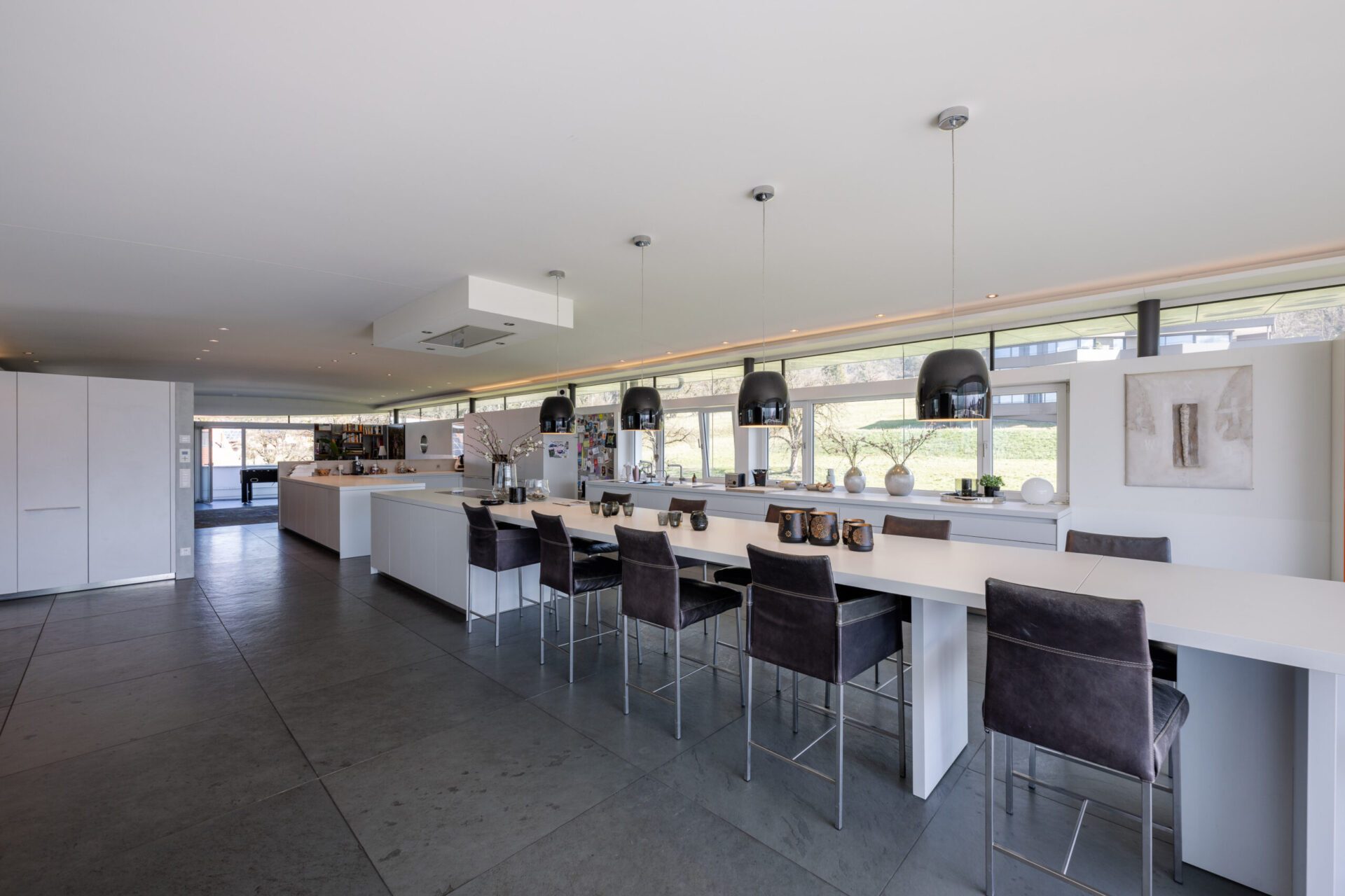 Das Herzstück des Hauses befindet sich im Dachgeschoss: Ein grosszügig gestalteter Wohn-, Küchen- und Essbereich mit Traumaussicht, der durch seine offene Architektur und die Helligkeit besticht. Hier trifft modernes Design auf behagliches Wohnen – der perfekte Ort für gemeinsame Stunden und gesellige Abende.