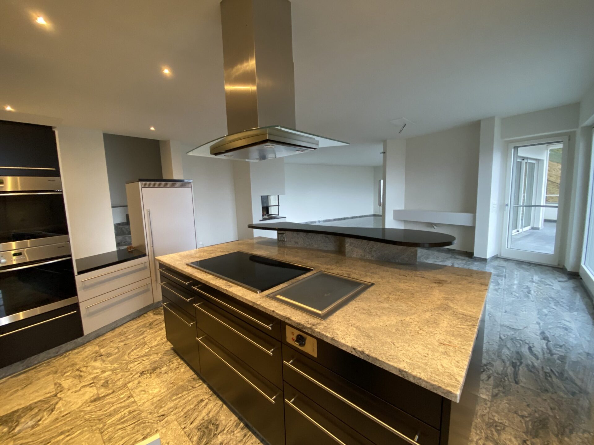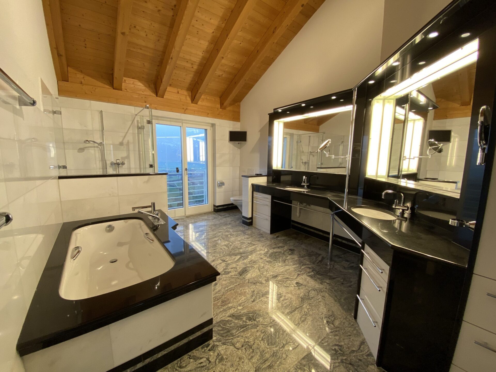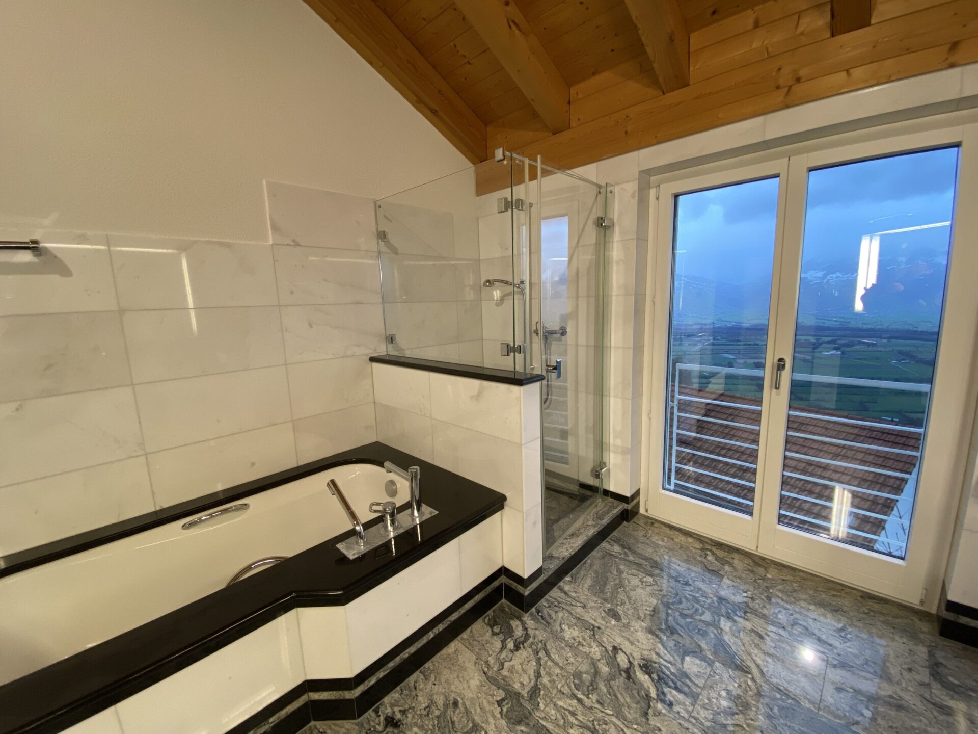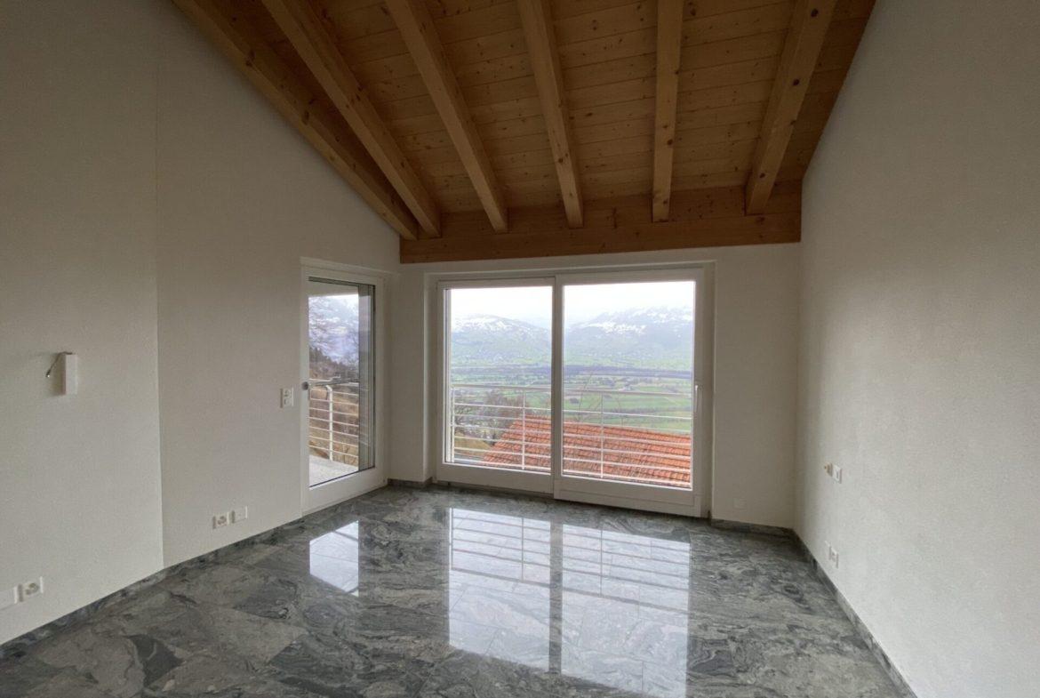 Die Materialien im Innenbereich des Hauses sind hochwertig gewählt. Ein eleganter Steinboden führt durch das gesamte Haus. Im Wohnbereich gibt es ein Cheminée, welches für eine wohlige Atmosphäre sorgt und eine Abtrennung zum Eingangsbereich bietet. Die moderne Küche punktet mit vielen Extras. Eine grosse, teils gedeckte Terrasse führt um den Küchen-/Wohn-Essbereich und bietet einen wunderbaren Ausblick. Die Raumeinteilung des Hauses ist grosszügig und offen gestaltet. Zwei Schlafzimmer im Obergeschoss haben jeweils Zugang auf den Balkon. Eine geräumige Ankleide bietet entsprechenden Stauraum für Kleidung etc.