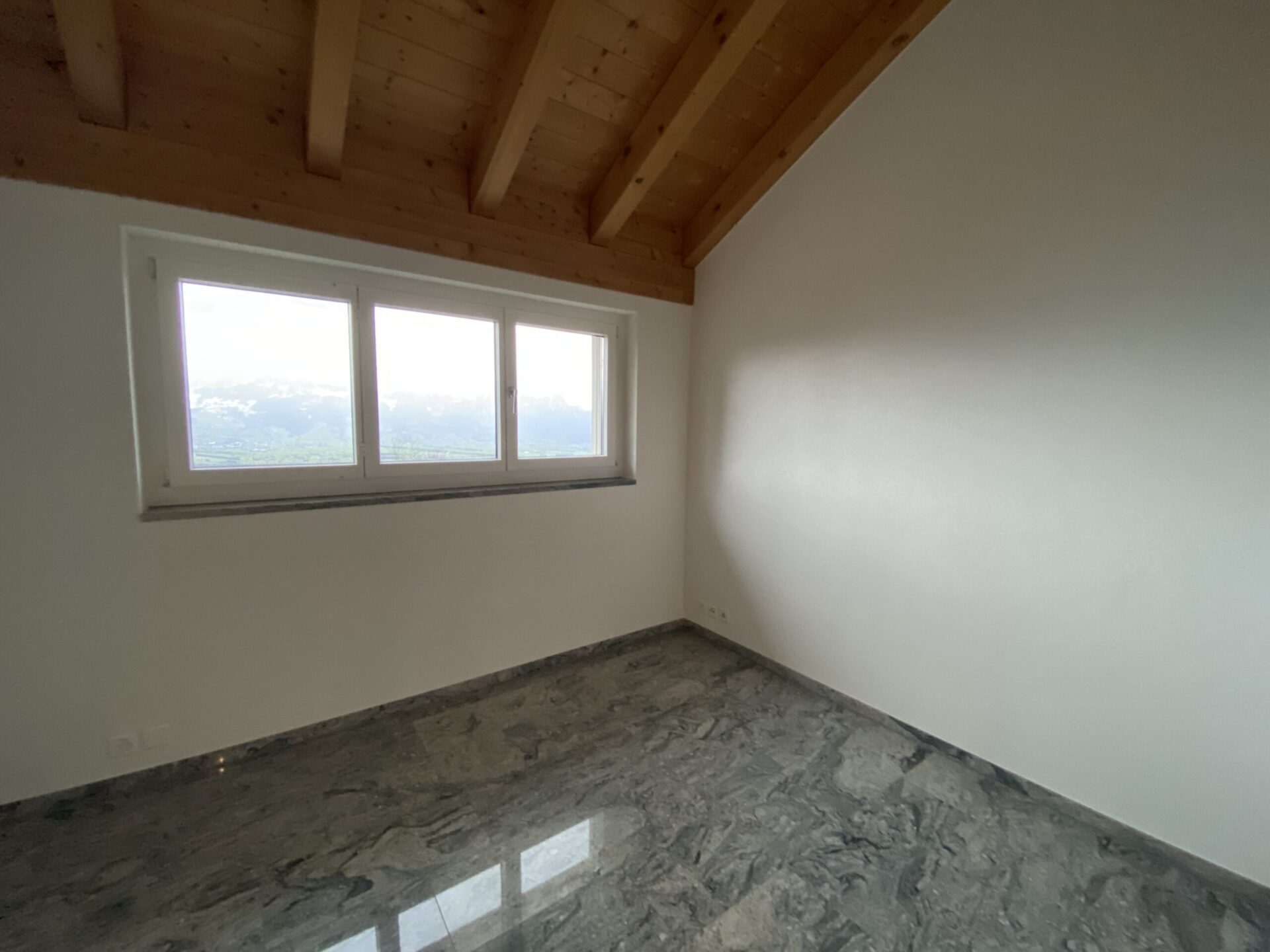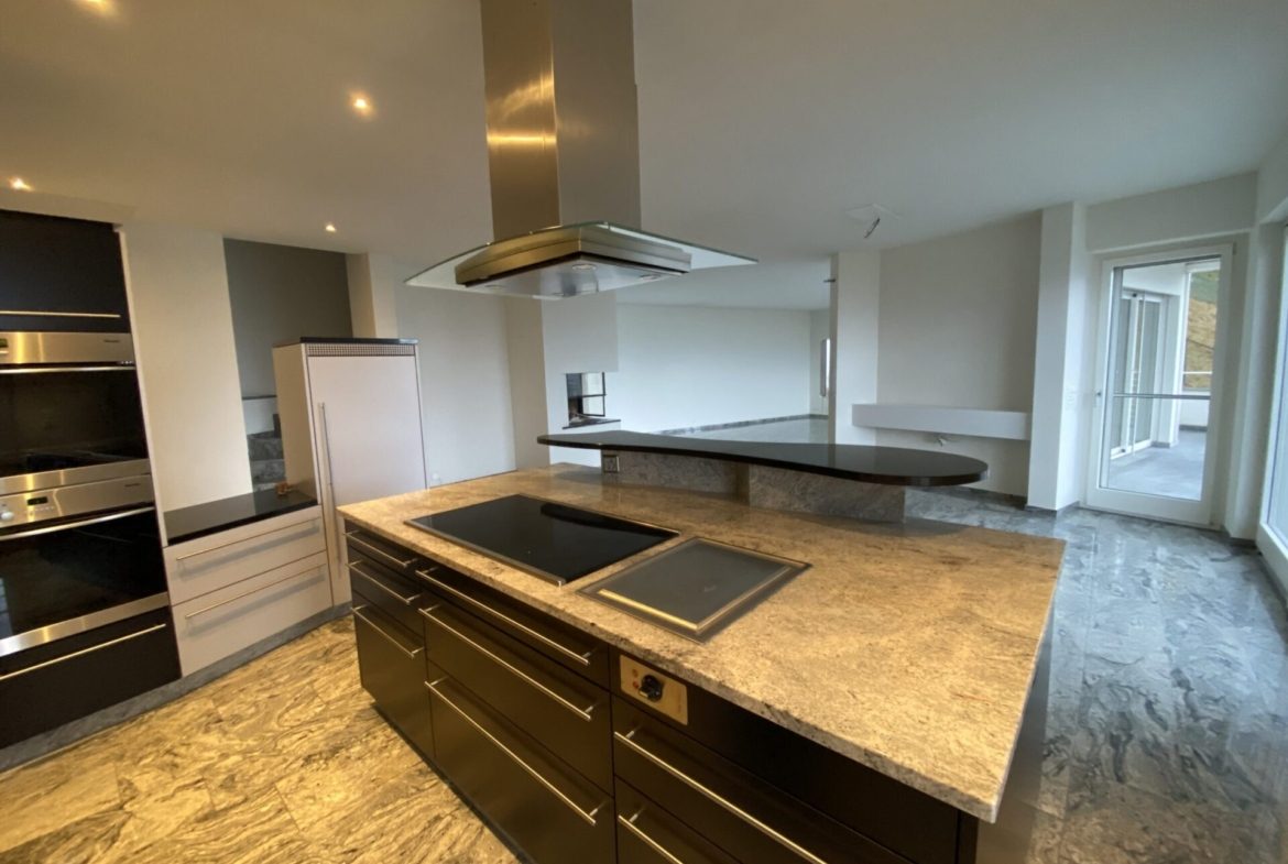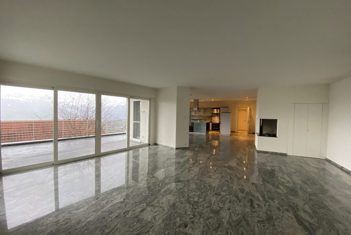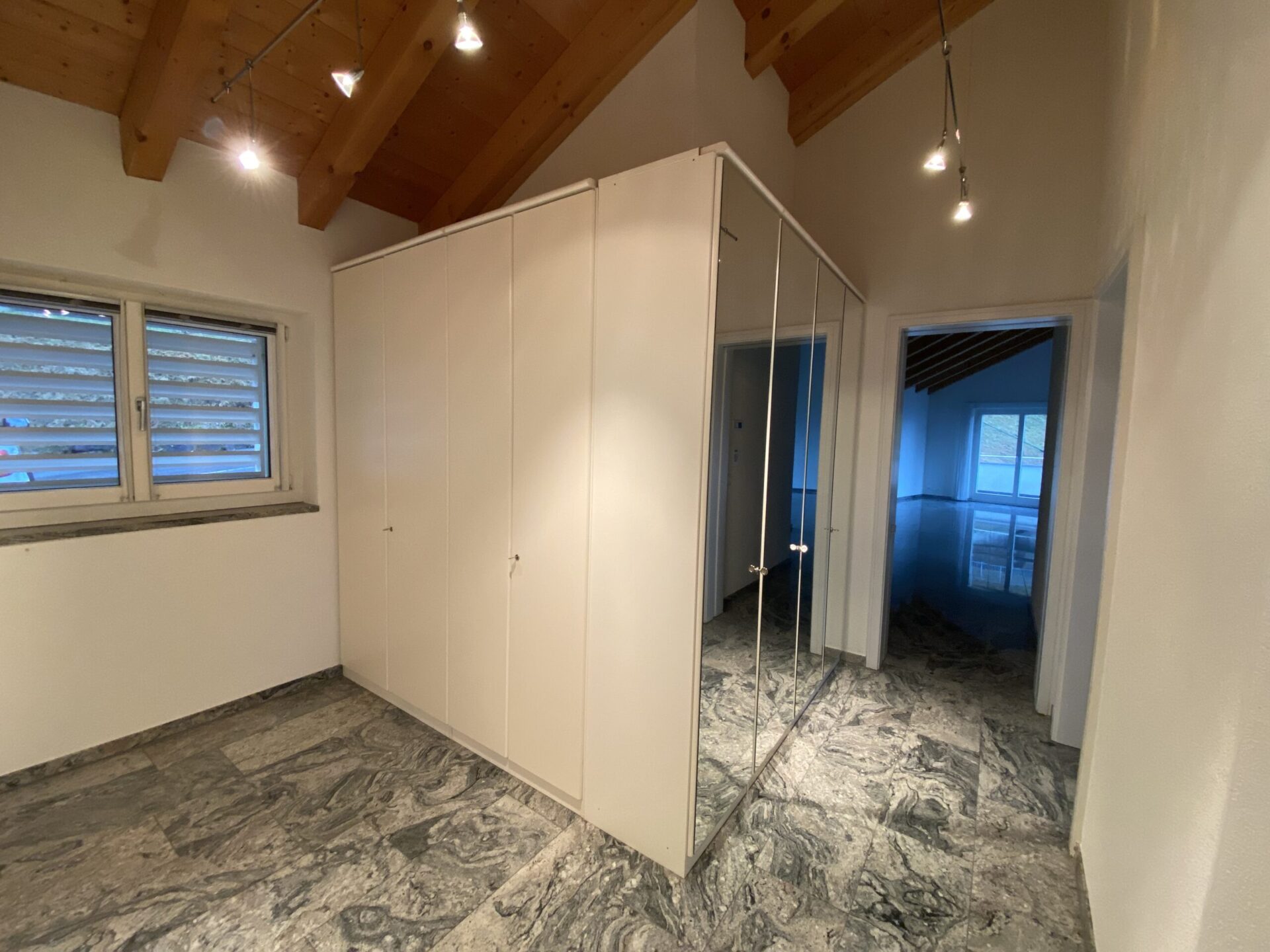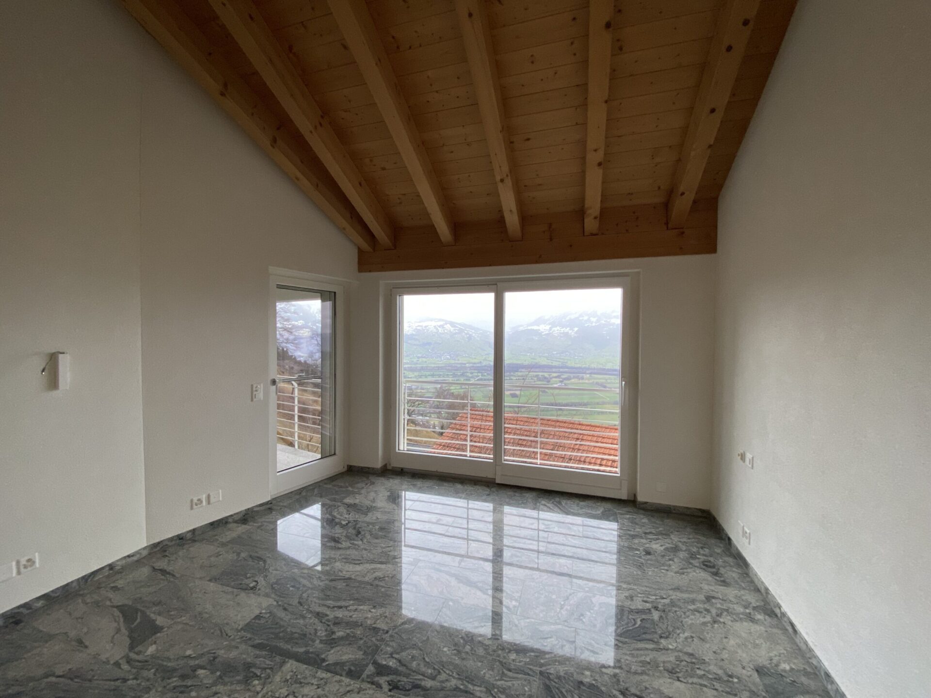 Die Materialien im Innenbereich des Hauses sind hochwertig gewählt. Ein eleganter Steinboden führt durch das gesamte Haus. Im Wohnbereich gibt es ein Cheminée, welches für eine wohlige Atmosphäre sorgt und eine Abtrennung zum Eingangsbereich bietet. Die moderne Küche punktet mit vielen Extras. Eine grosse, teils gedeckte Terrasse führt um den Küchen-/Wohn-Essbereich und bietet einen wunderbaren Ausblick. Die Raumeinteilung des Hauses ist grosszügig und offen gestaltet. Zwei Schlafzimmer im Obergeschoss haben jeweils Zugang auf den Balkon. Eine geräumige Ankleide bietet entsprechenden Stauraum für Kleidung etc.