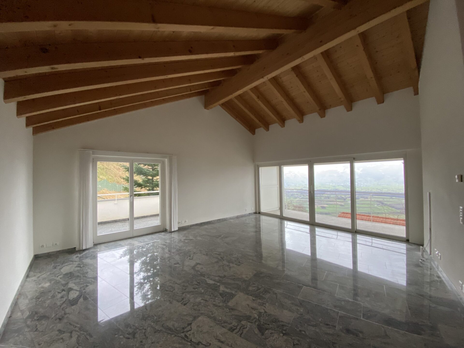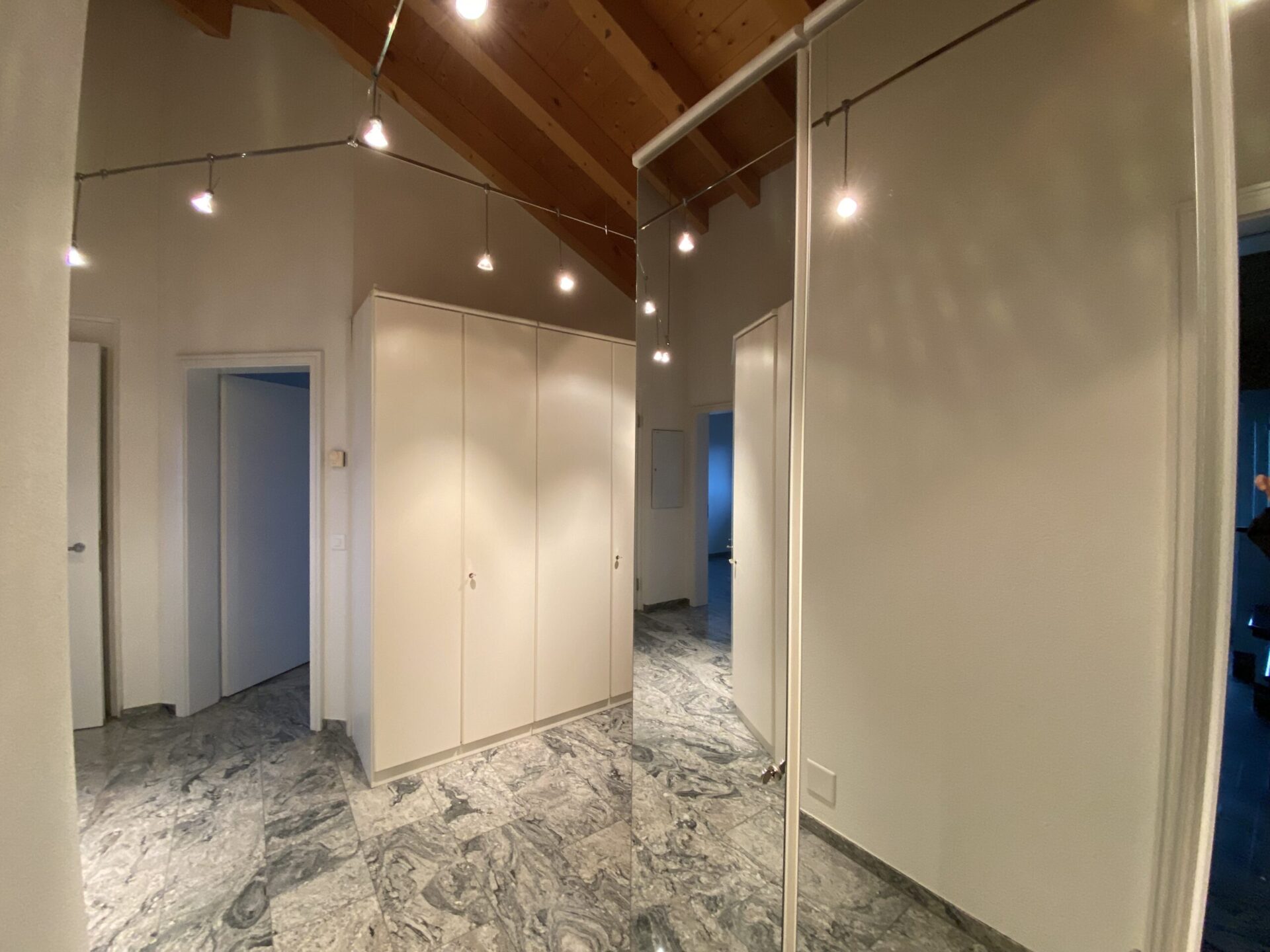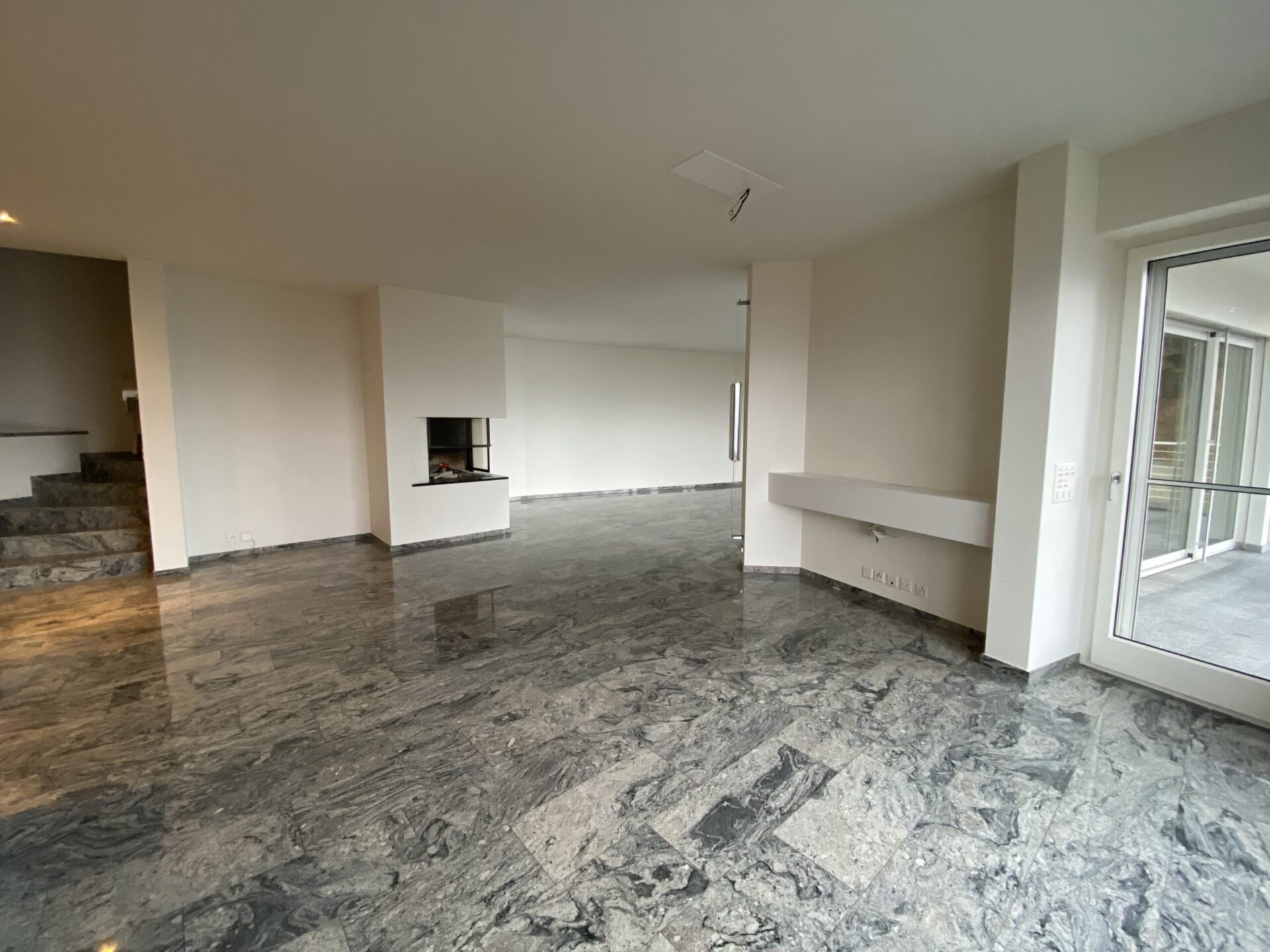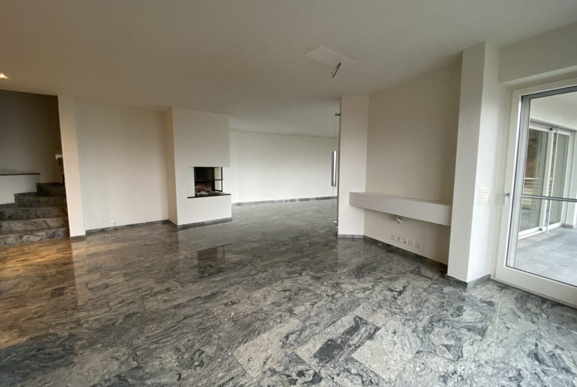 Die Materialien im Innenbereich des Hauses sind hochwertig gewählt. Ein eleganter Steinboden führt durch das gesamte Haus. Im Wohnbereich gibt es ein Cheminée, welches für eine wohlige Atmosphäre sorgt und eine Abtrennung zum Eingangsbereich bietet. Die moderne Küche punktet mit vielen Extras. Eine grosse, teils gedeckte Terrasse führt um den Küchen-/Wohn-Essbereich und bietet einen wunderbaren Ausblick. Die Raumeinteilung des Hauses ist grosszügig und offen gestaltet. Zwei Schlafzimmer im Obergeschoss haben jeweils Zugang auf den Balkon. Eine geräumige Ankleide bietet entsprechenden Stauraum für Kleidung etc.