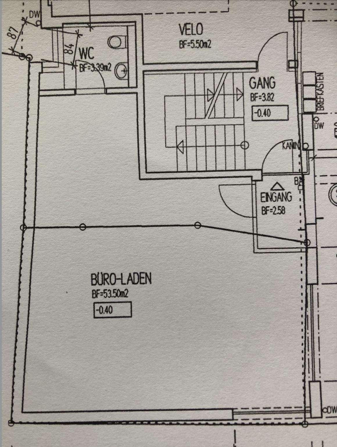 • Parkplatz: Einen Aussenparkplatz kann man sich von einem andern Vermieter vor dem Eingang mieten, einen Garagenparkplatz könnte man zum jetzigen Zeitpunkt nur vielleicht dazu mieten. Kundenparkplätze sind 1 Minute zu Fuss vom Gebäude entfernt.
