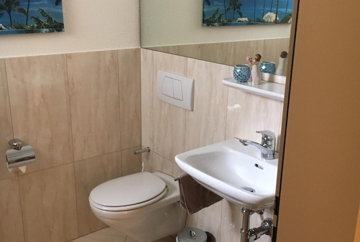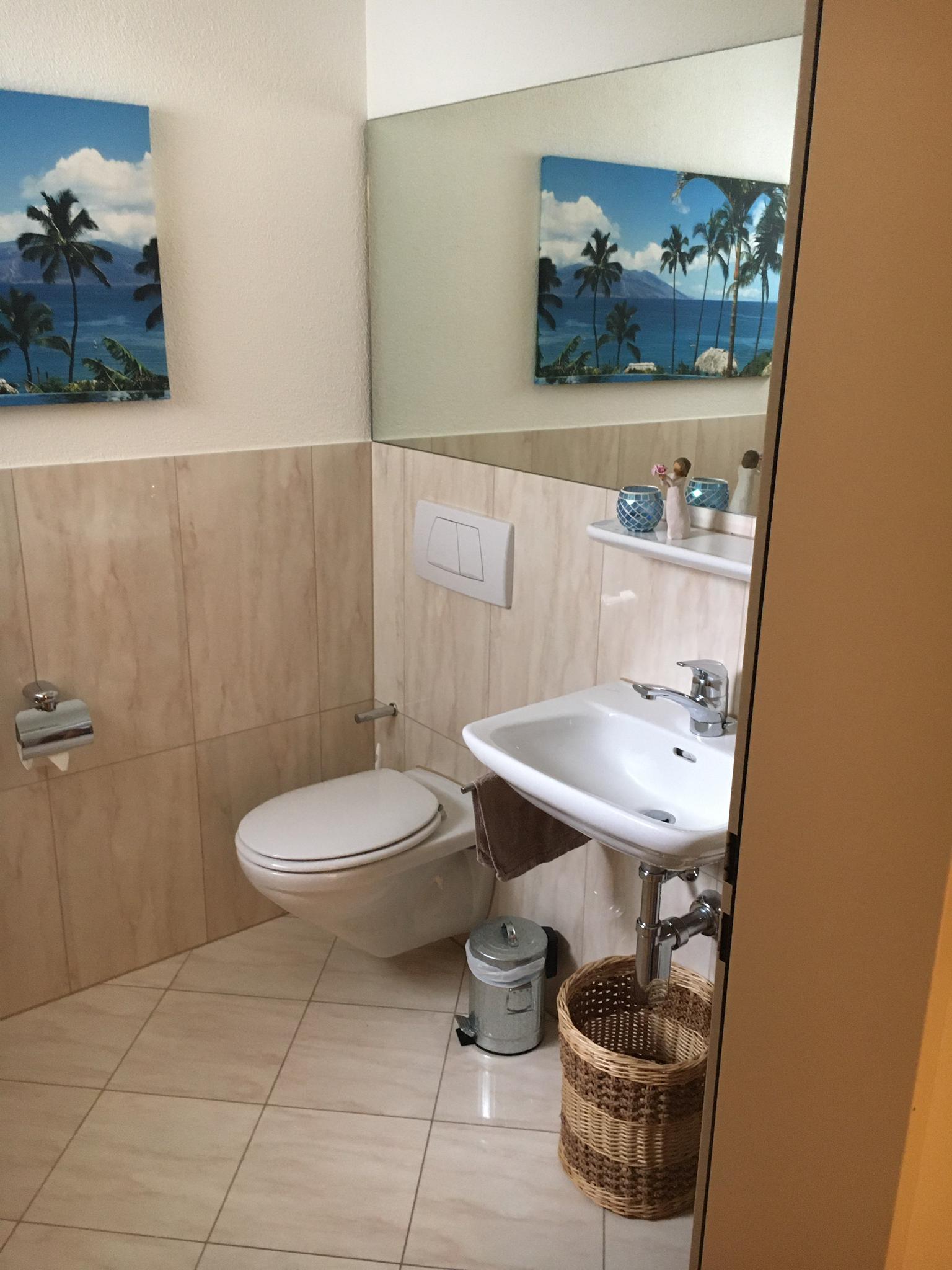 • Separates Badezimmer: Gefliestes Bad mit WC, Waschbecken und Spiegel