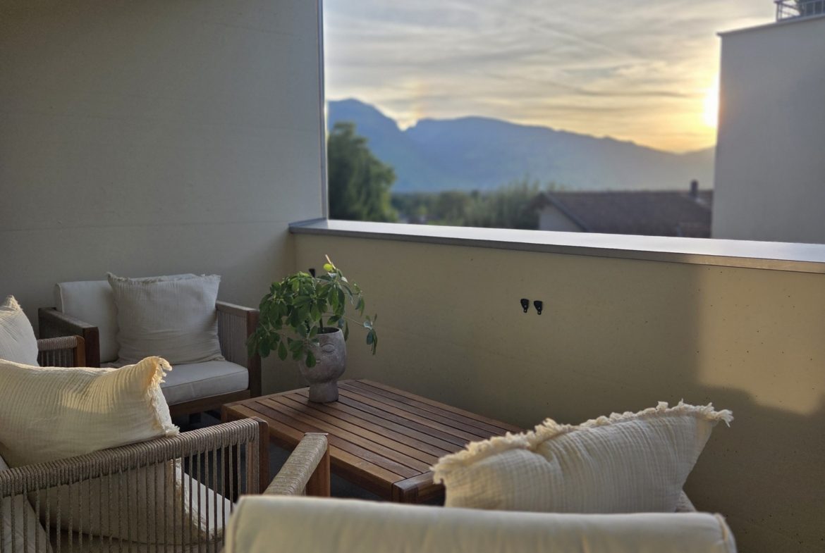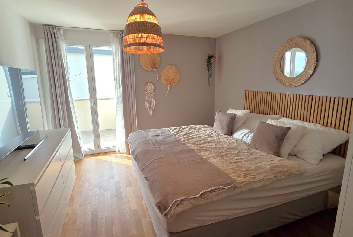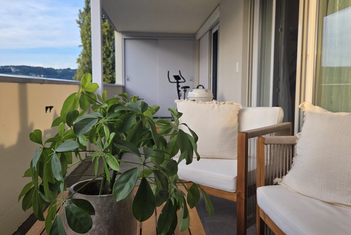 Die Wohnung umfasst ein grosses und helles Wohn- und Esszimmer, zwei gemütliche Zimmer sowie eine moderne Küche mit hochwertigen Geräten. Das stilvolle Badezimmer ist gepflegt und praktisch gestaltet. Ergänzt wird das Raumangebot durch einen sonnigen Balkon mit zusätzlichem Abstellraum – ideal für Stauraum oder saisonale Gegenstände.