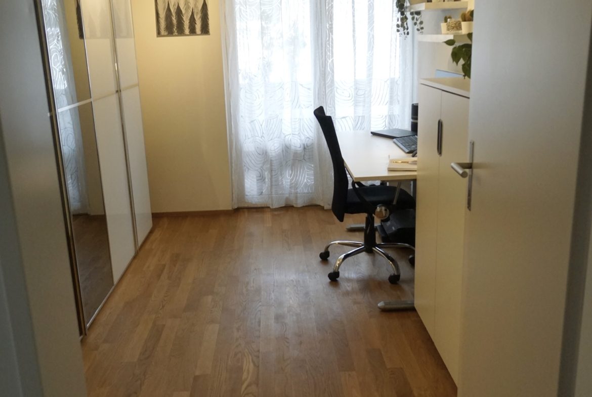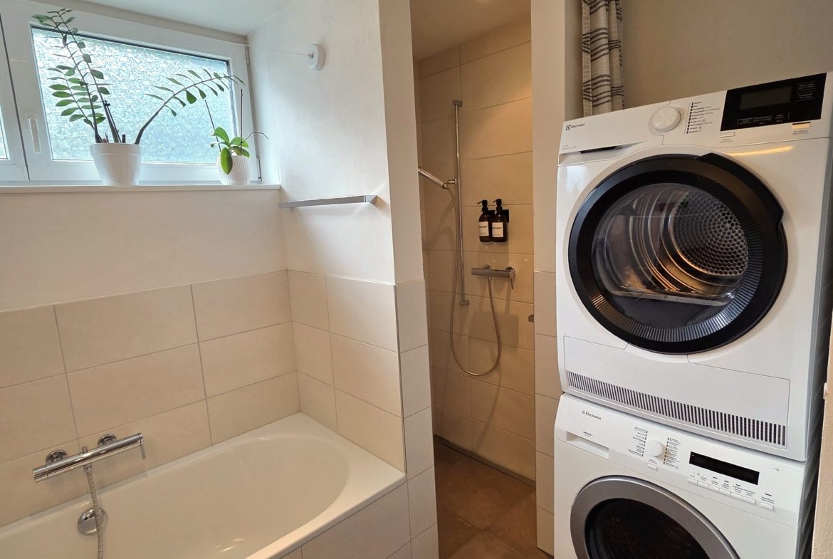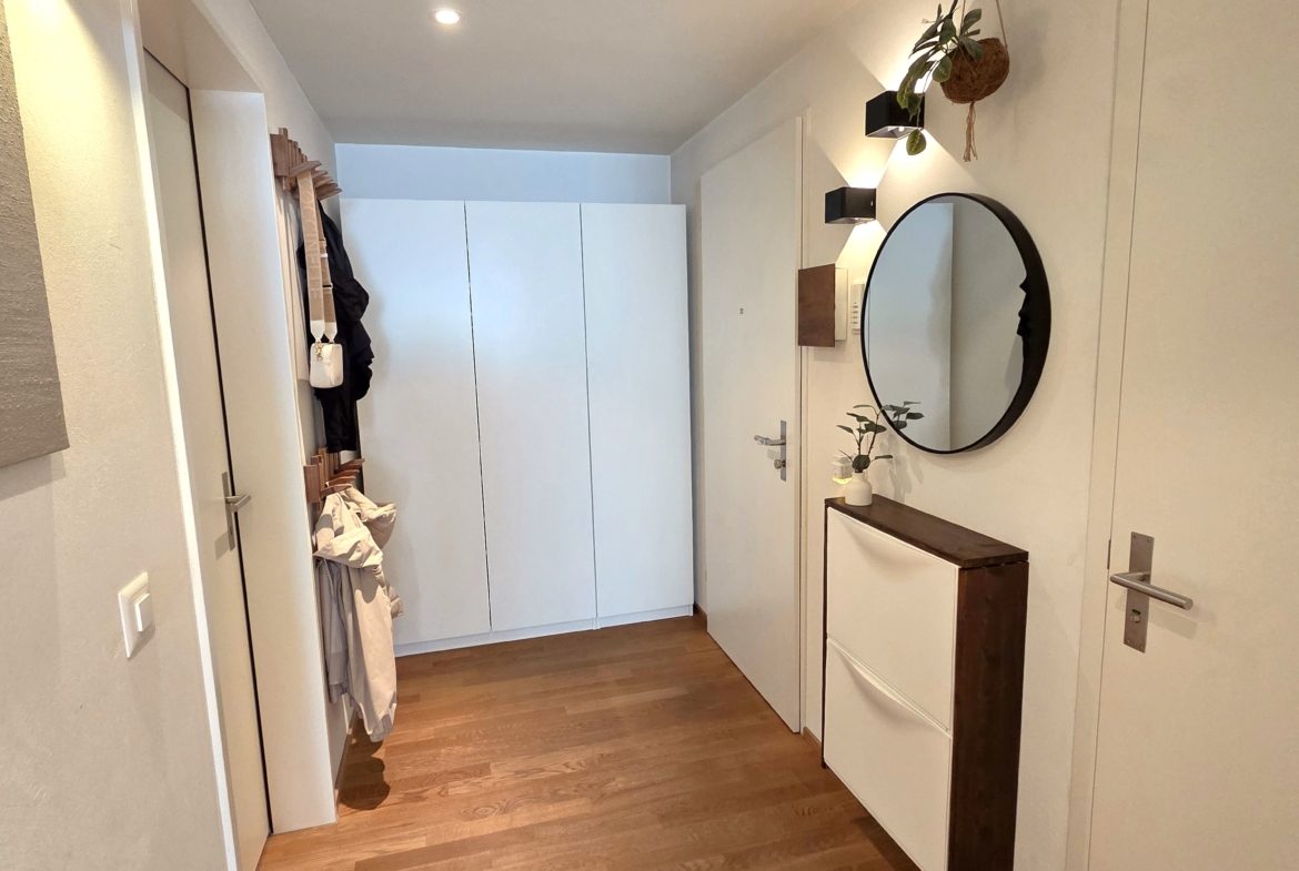 Die Lage ist optimal: Direkt nebendran befinden sich Bushaltestellen, gegenüber liegt die Post, und ein Einkaufsladen ist nur wenige Schritte entfernt. Kindergarten und Primarschule sind ebenfalls in kurzer Gehdistanz erreichbar, was die Wohnung besonders attraktiv für Paare, Singles sowie kleine Familien macht.