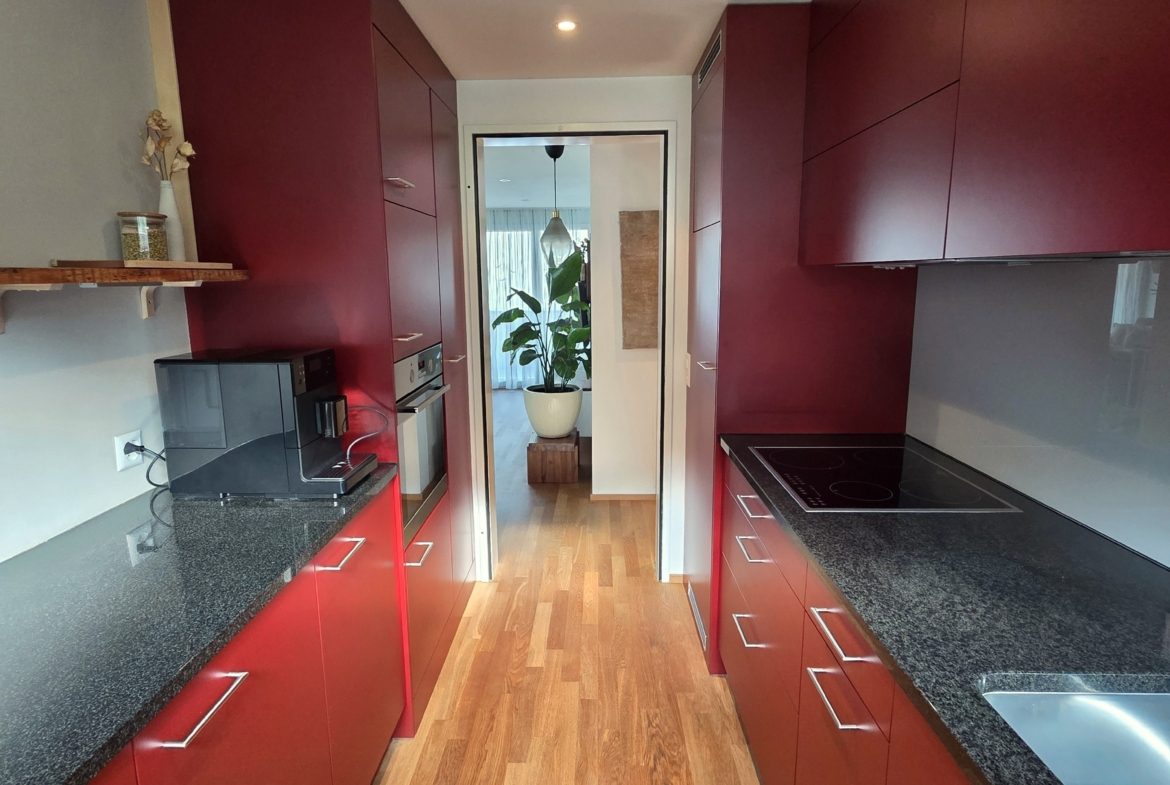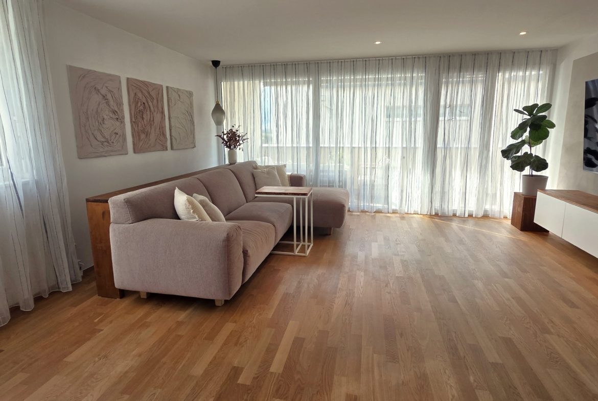 Diese lichtdurchflutete 3.5-Zimmer-Wohnung mit grosszügigen 88 m² bietet ein modernes, offenes Wohngefühl und überzeugt durch eine hervorragend durchdachte Raumaufteilung. Ursprünglich als 4.5-Zimmer-Wohnung konzipiert, wurde auf Wunsch eine Trennwand nicht gesetzt, sodass heute ein weitläufiger Wohn- und Essbereich entsteht, der maximale Grosszügigkeit und Komfort bietet.