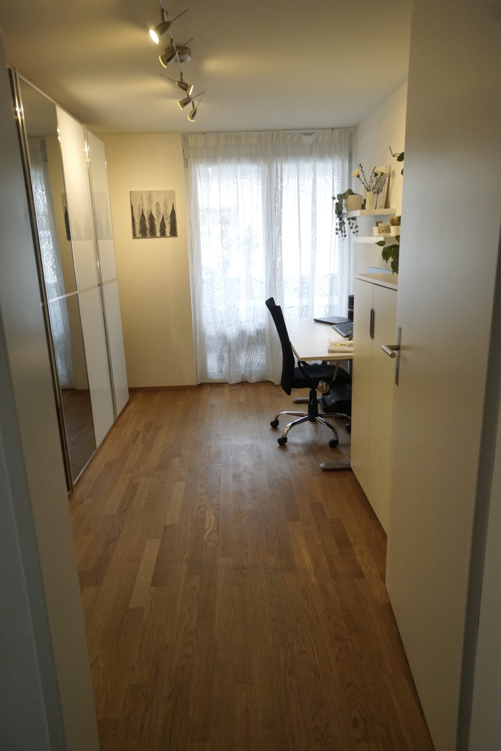 Grundrissplan leider nicht ganz stimmig. Schlafzimmer (Zimmer 2) ist grösser als das Büro (Zimmer 1). Badezimmer anders eingeteilt sowie bei Zimmer 3 ist entsprechend die Wand weg.