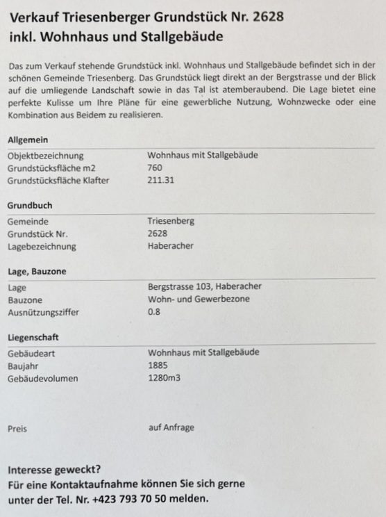 Das zum Verkauf stehende Grundstück inkl. Wohnhaus und Stallgebäude befindet sich in der schönen Gemeinde Triesenberg. Das Grundstück liegt direkt an der Bergstrasse und der Blick auf die umliegende Landschaft sowie in das Tal ist atemberaubend. Die Lage bietet eine perfekte Kulisse um ihre Pläne für eine gewerbliche Nutzung, Wohnhaus oder eine Kombination von Beidem zu realisieren.