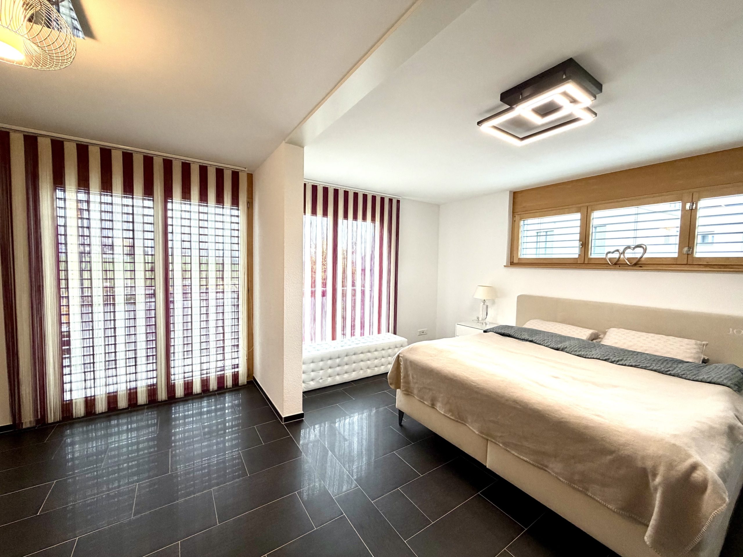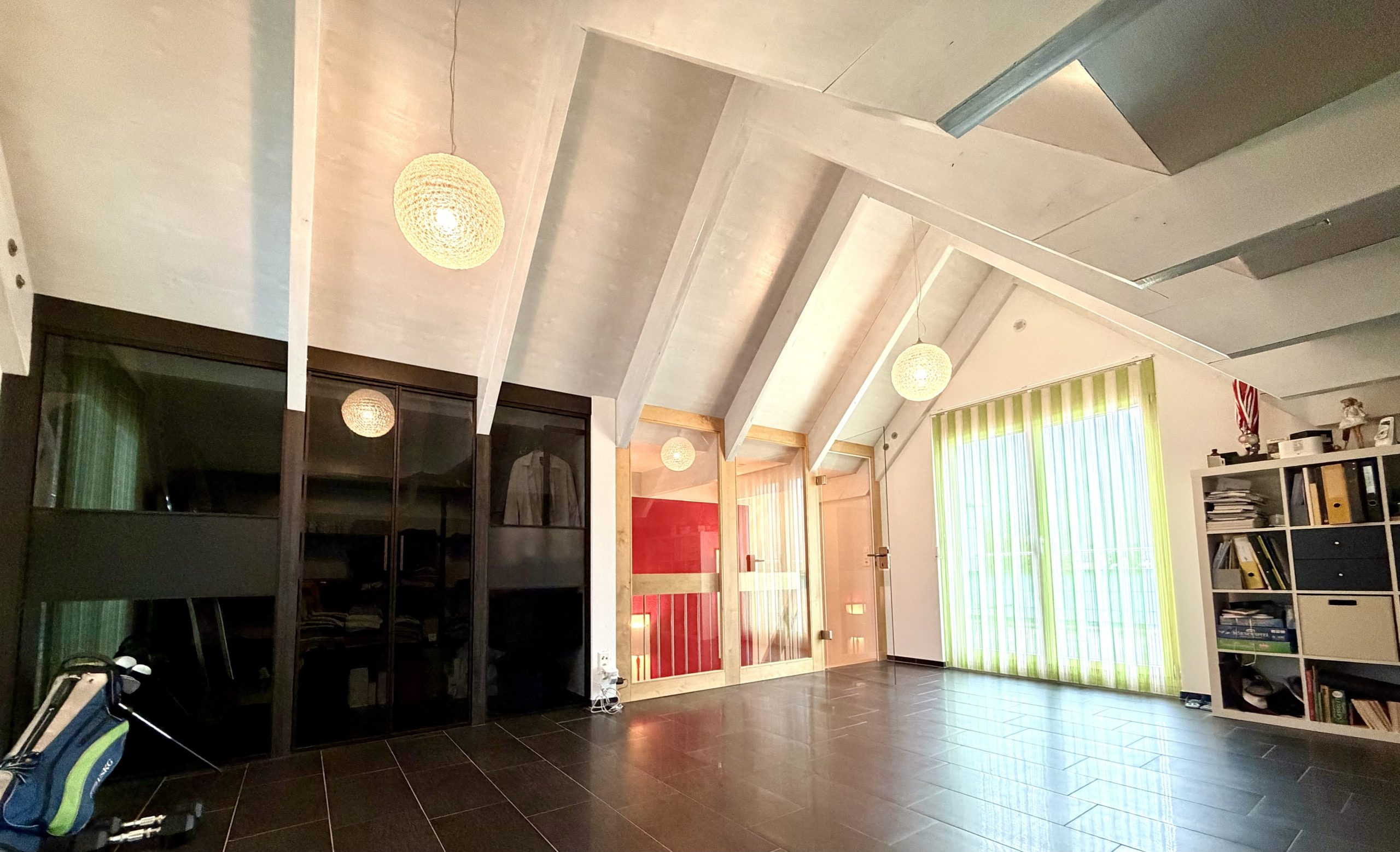 Im 2. OG, dem Dachgeschoss, befindet sich ein grosszügiges Hauptschlafzimmer oder Büro nach Bedarf, mit begehbarer Garderobe und Zugang zu einer grosszügigen ca. 20 m² Terrasse mit schöner Bergansicht.