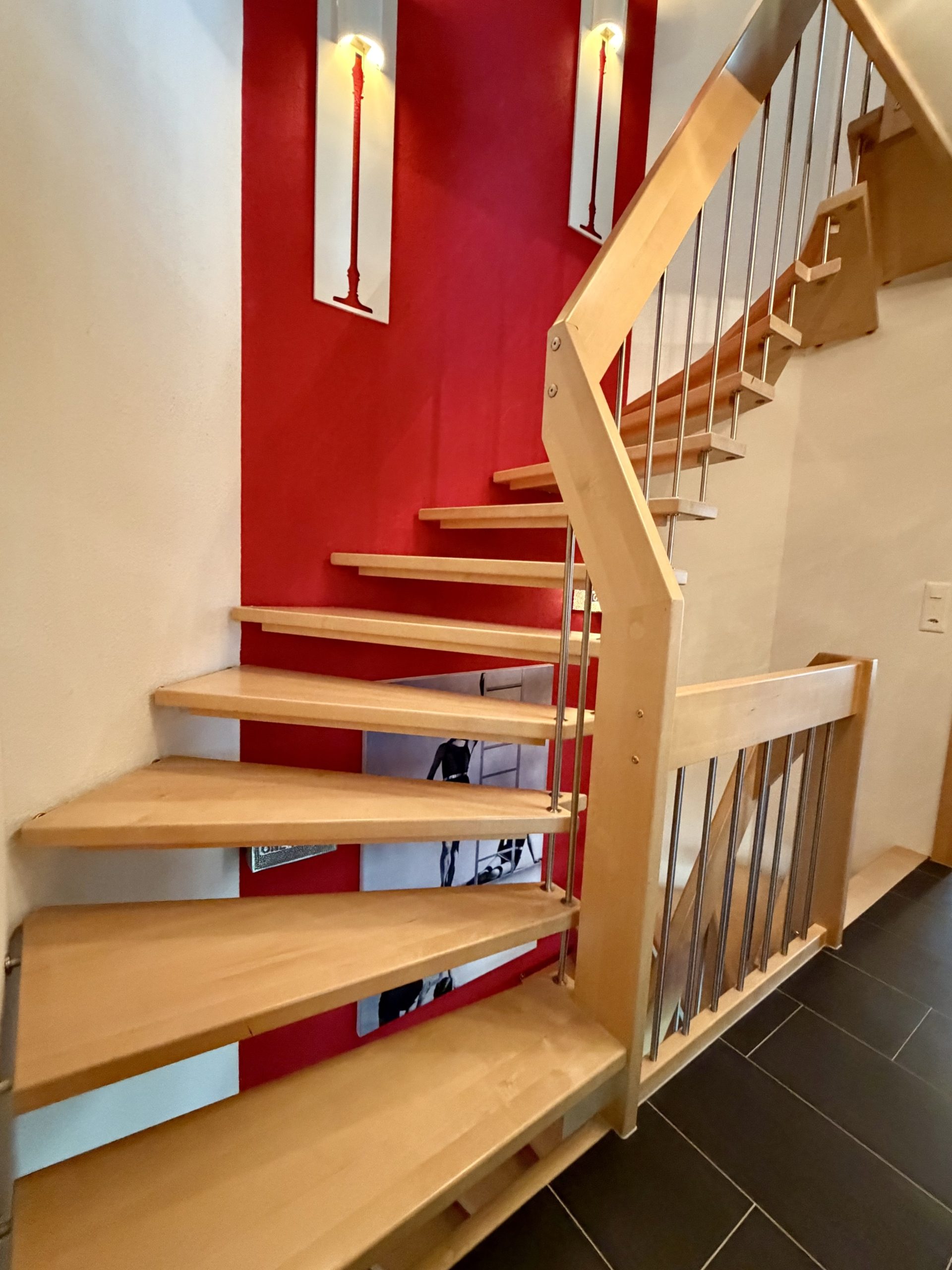 Im Erdgeschoss befindet sich ein grosser ca. 50 m² grosser Wohn-Essbereich mit einem modernen Schwedenofen, der für Gemütlichkeit sorgt. Der Zugang zu einer ca. 40 m² grossen Terrasse und dem Garten lädt zu entspannten Stunden im Freien ein. Der Garten ist mit zwei Gardena Mähroboter und einer Gardena Bewässerungsanlage ausgestattet, welche über eine App steuerbar ist.