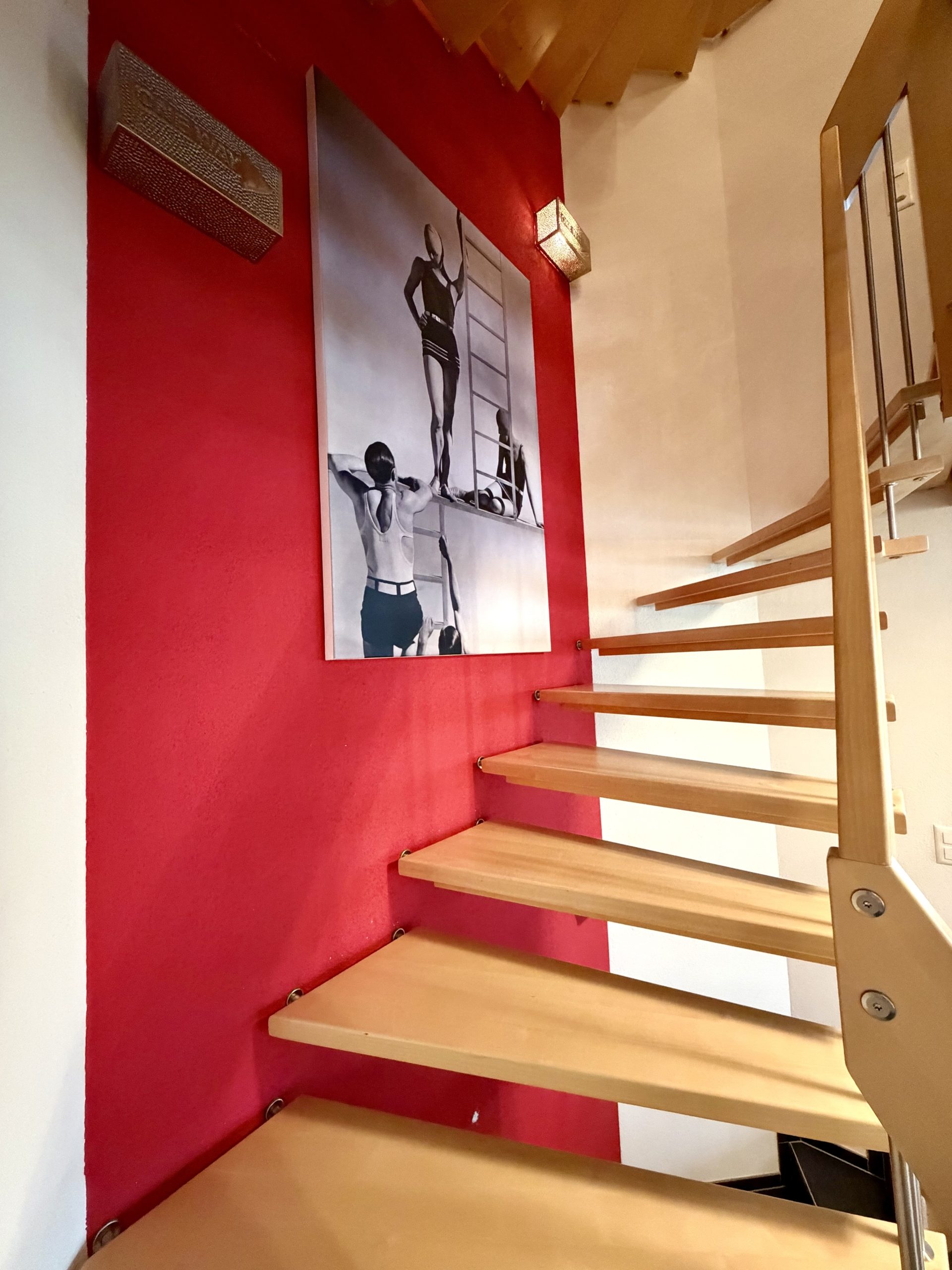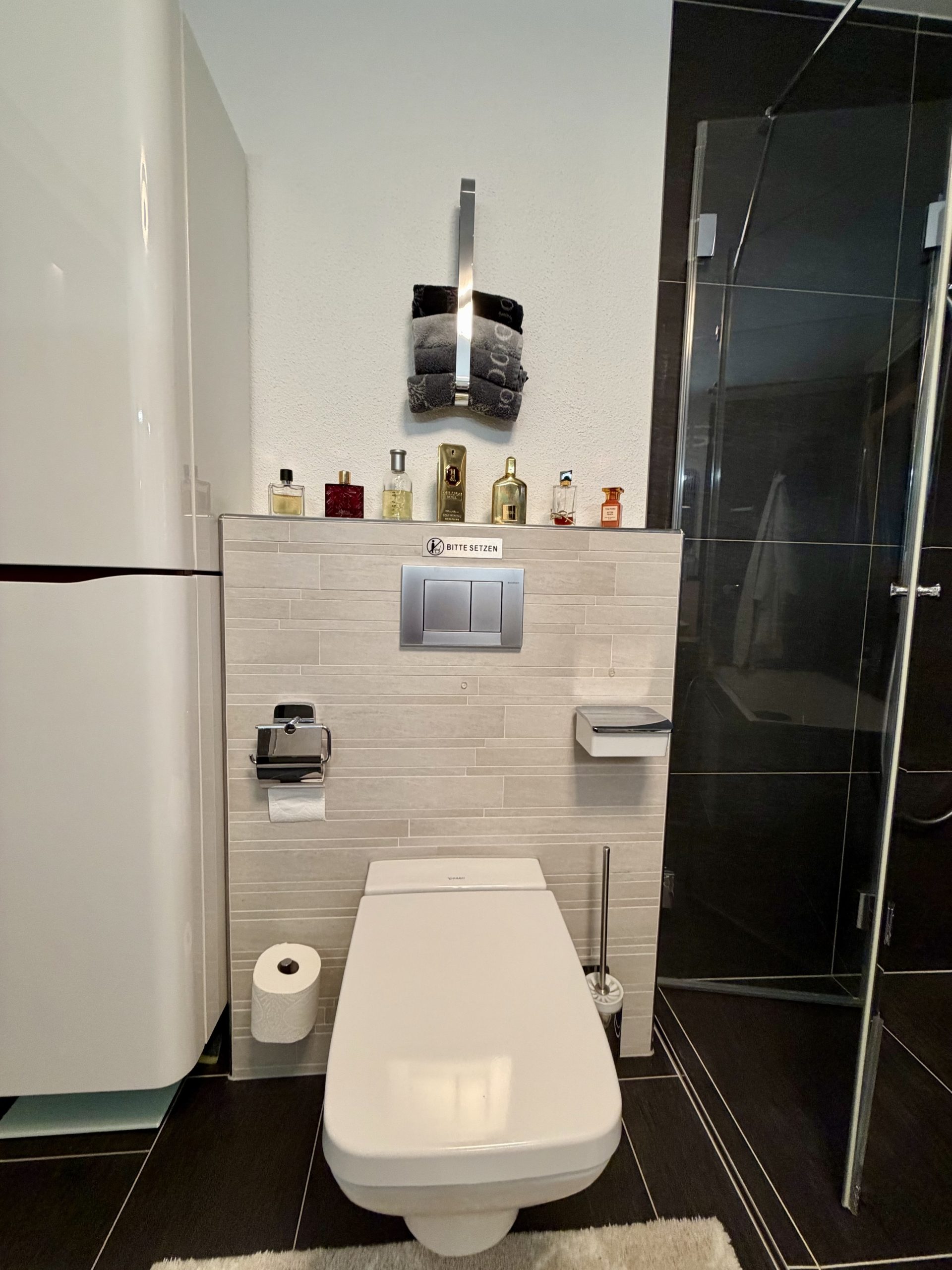 Im 1. OG befinden sich zwei Zimmer (laut Plan sind es 3 Zimmer, zwei davon wurden zusammengelegt), eines davon mit Zugang zum Balkon. Das grosszügige moderne Badezimmer verfügt über eine Badewanne, Dusche und WC, sowie hochwertige Bademöbel von Duravit.