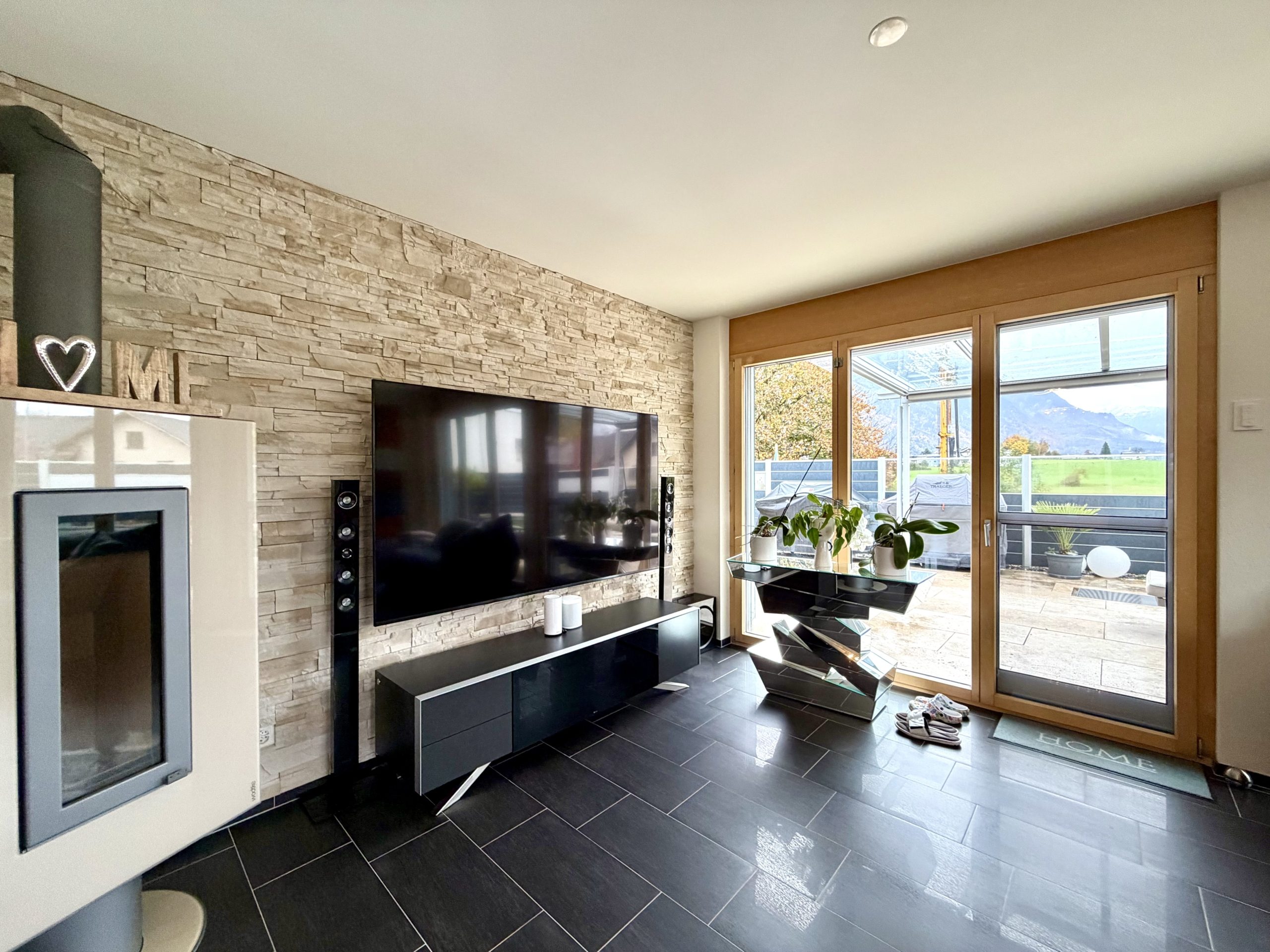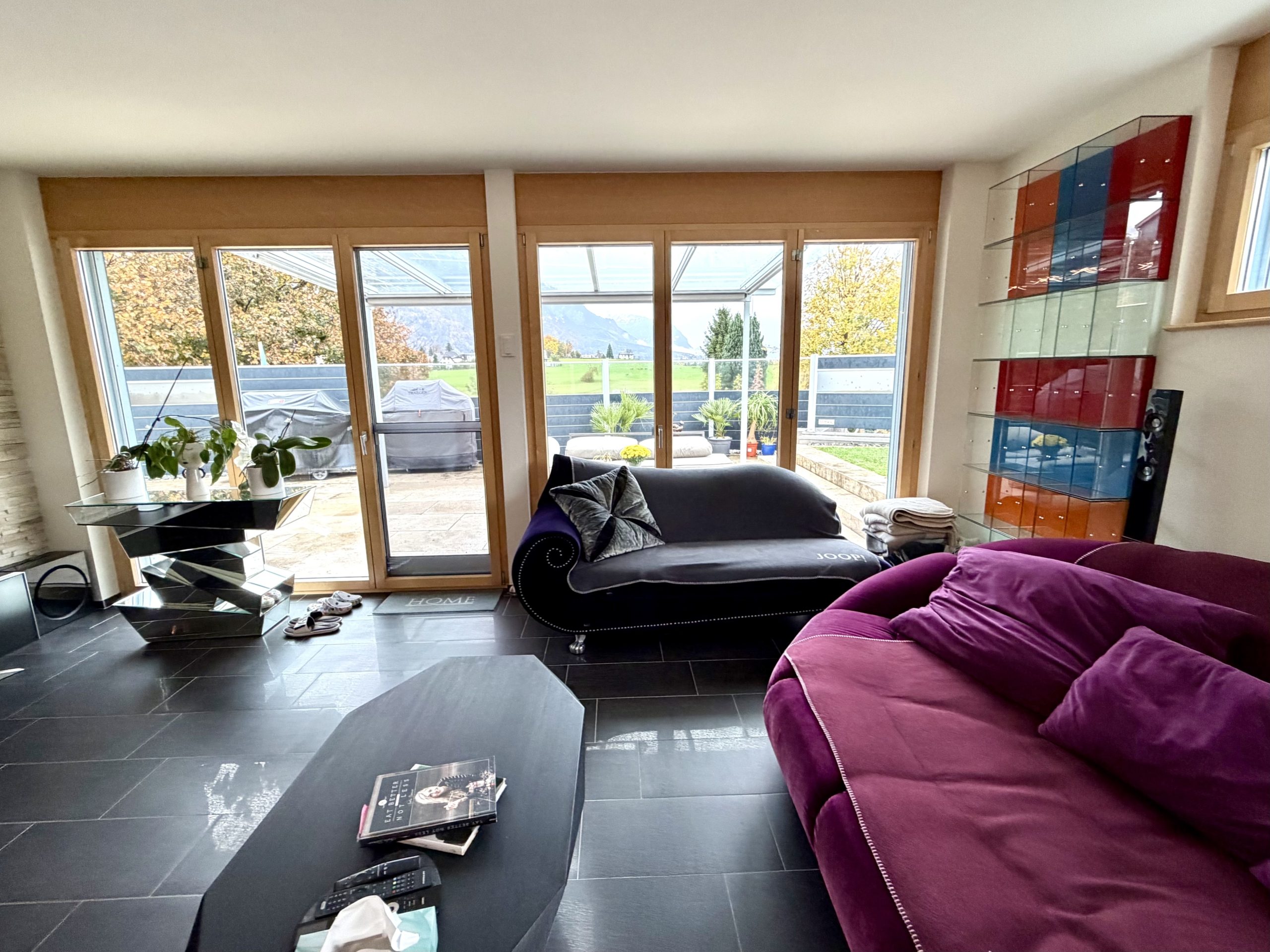 Eine Besonderheit dieses Hauses ist die atemberaubende Panoramaaussicht, die man vom Wohnbereich, Schlafzimmer und auch von der grosszügigen Terrasse mit Garten geniessen kann. Die Terrasse ist ideal für gesellige Abende mit Familie und Freunden.