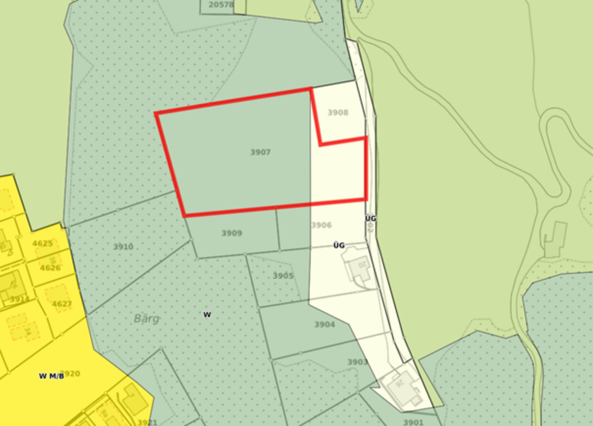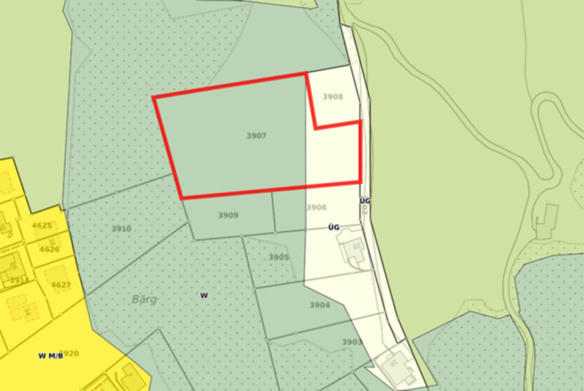 Das Grundstück umfasst insgesamt 3’626 m², davon sind 2’953 m² im Bereich Waldgebiet gelegen und die verbleibenden 673 m² fallen unter übriges Gemeindegebiet.