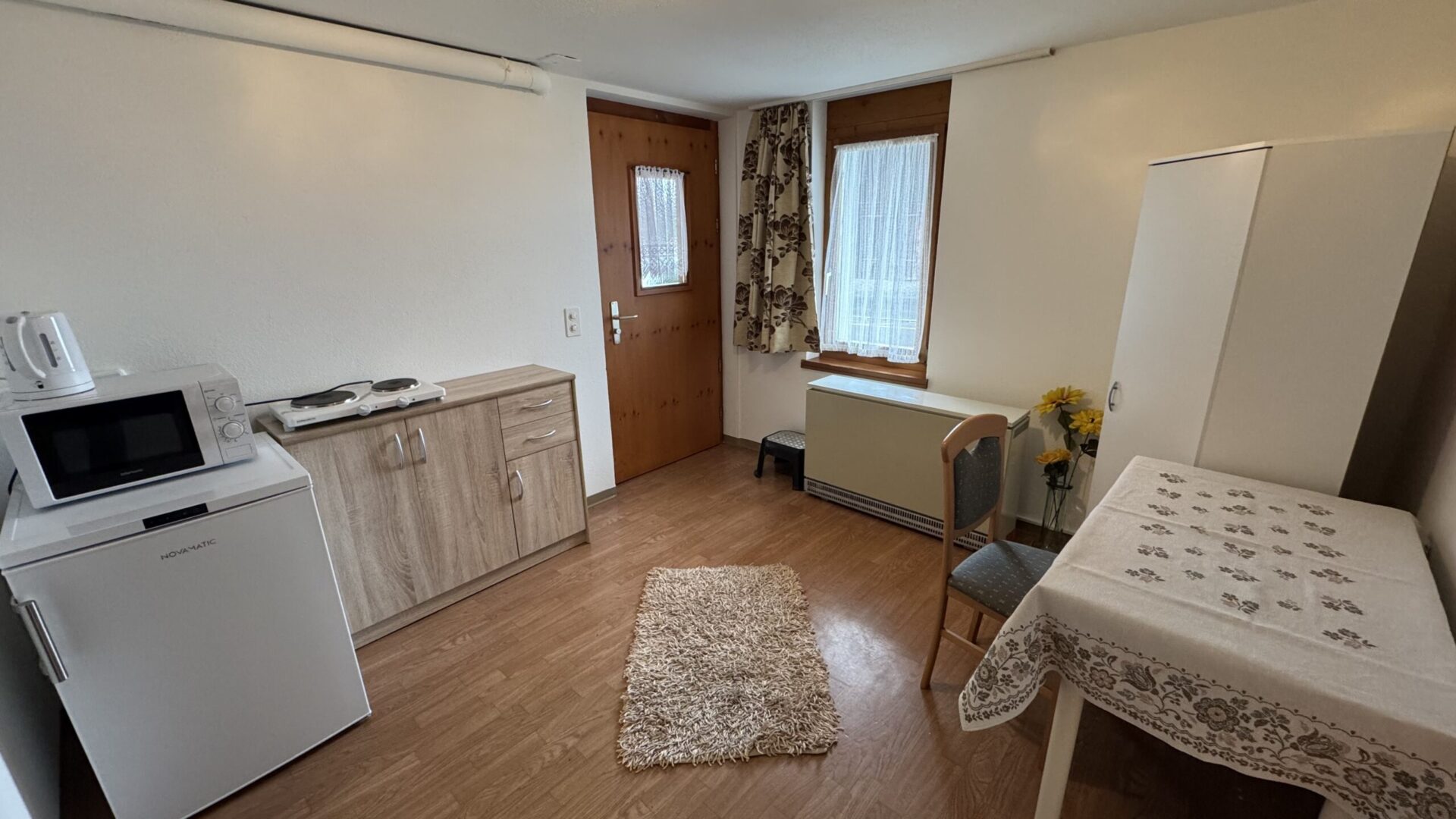 Die möblierte Wohnung verfügt über keine Einbauküche, ist jedoch mit einem Kühlschrank, einer Mikrowelle sowie einer elektrischen Herdplatte ausgestattet.