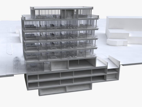 Das Gebäude umfasst sechs Geschosse, die flexibel unterteilbar und auf individuelle Bedürfnisse anpassbar sind. Grosse Fensterfronten sorgen für helle, freundliche Arbeitsräume und schaffen ein angenehmes Arbeitsumfeld.