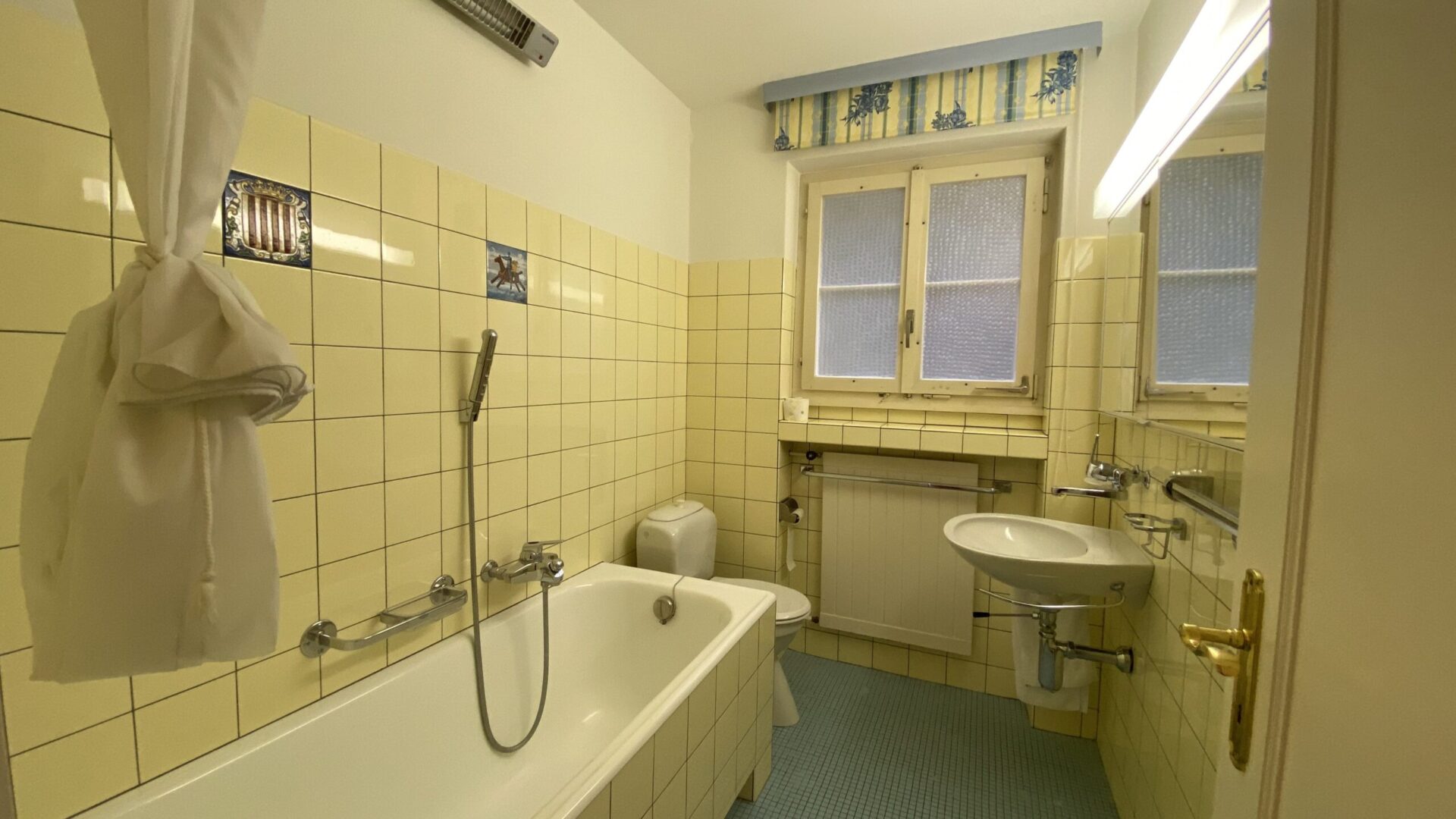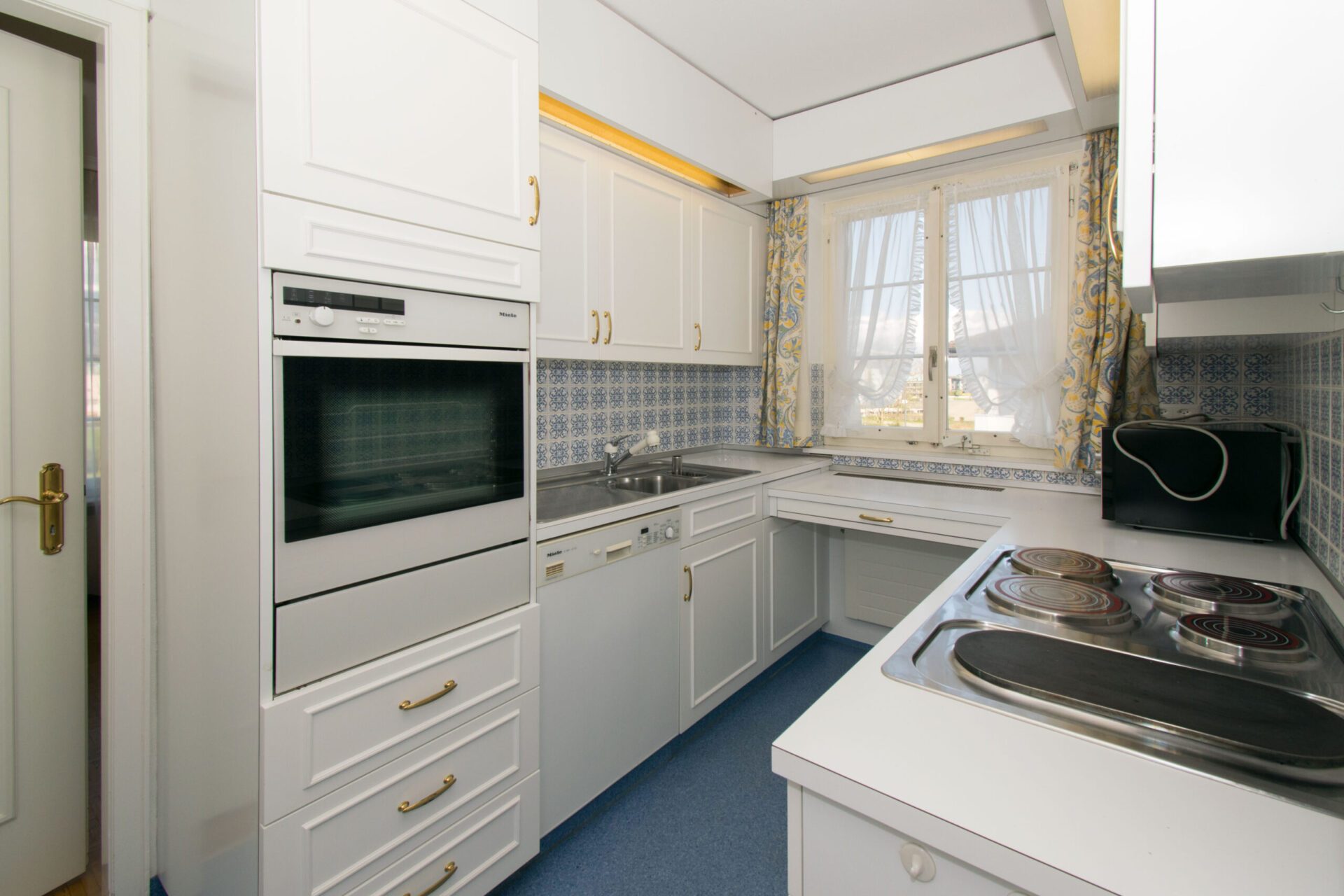 Küche mit Durchgang zum repräsentativen Ess- und Wohnzimmer, Schlafzimmer, Badezimmer mit Badewanne/WC, separates Gäste-WC und Garderobenbereich. Zugang zu einem sonnigen, südwestlich ausgerichteten Sitzplatz.