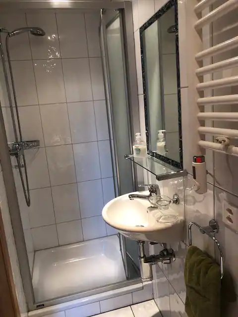 - kleines Badezimmer mit Dusche, Waschbecken und WC